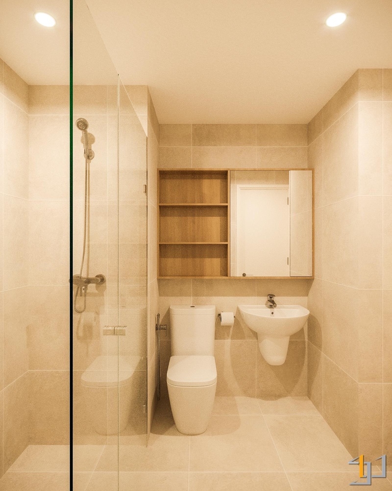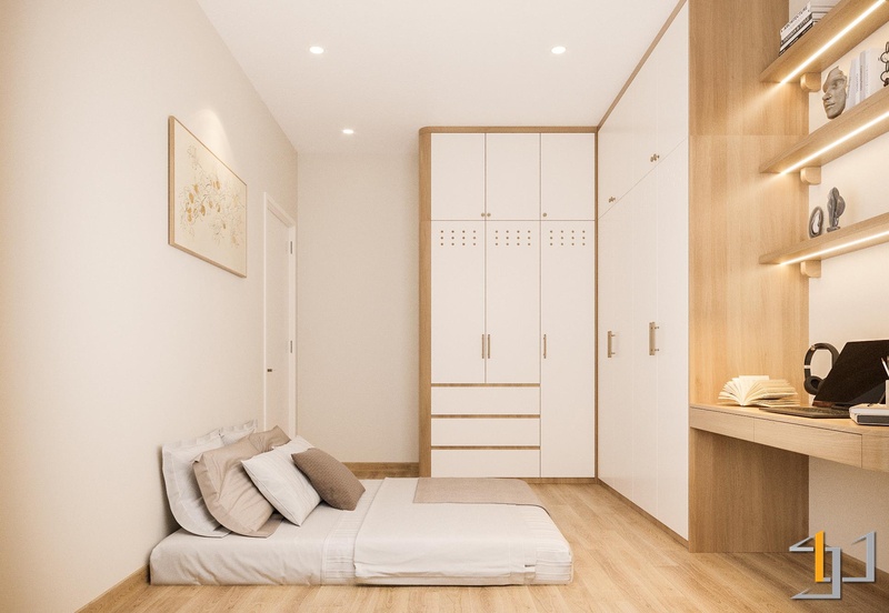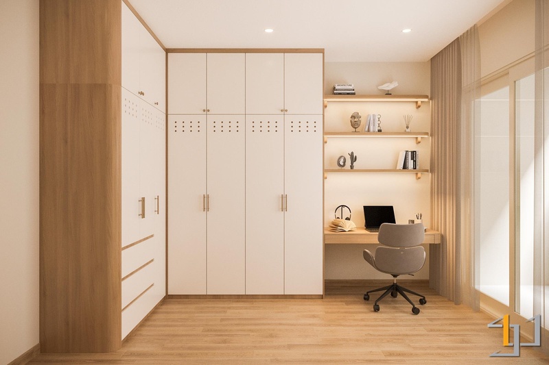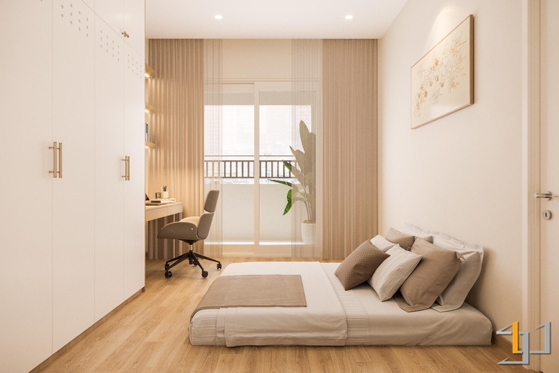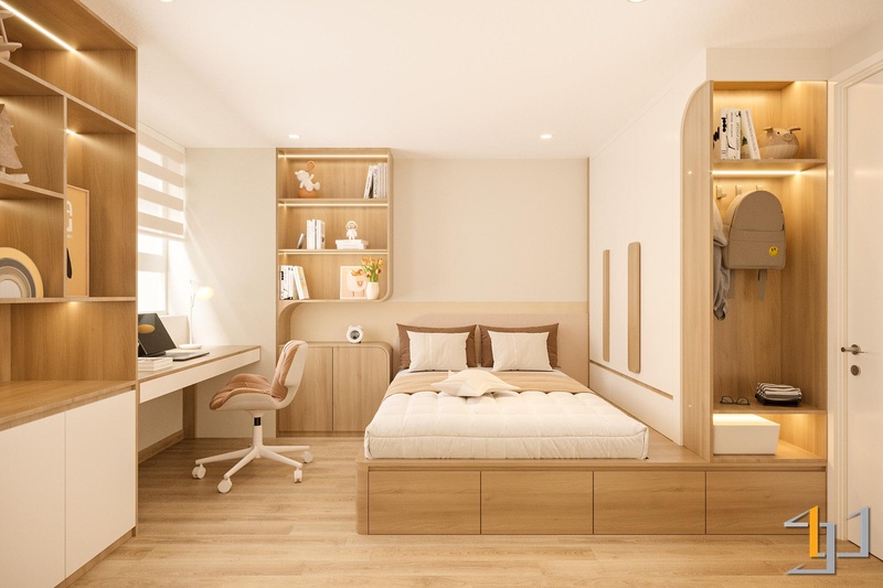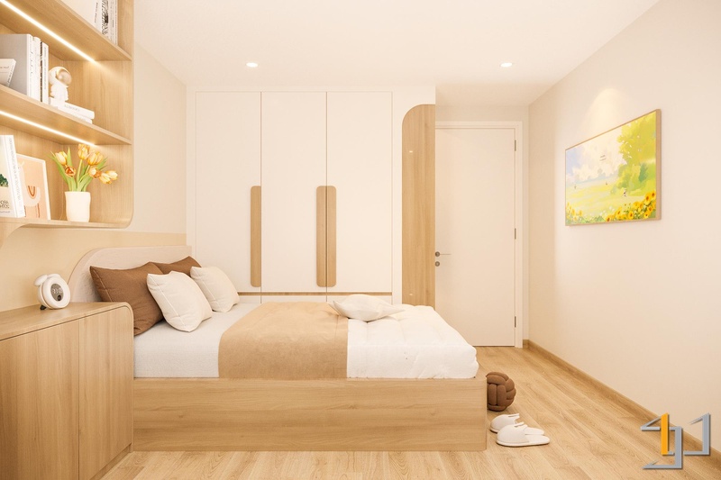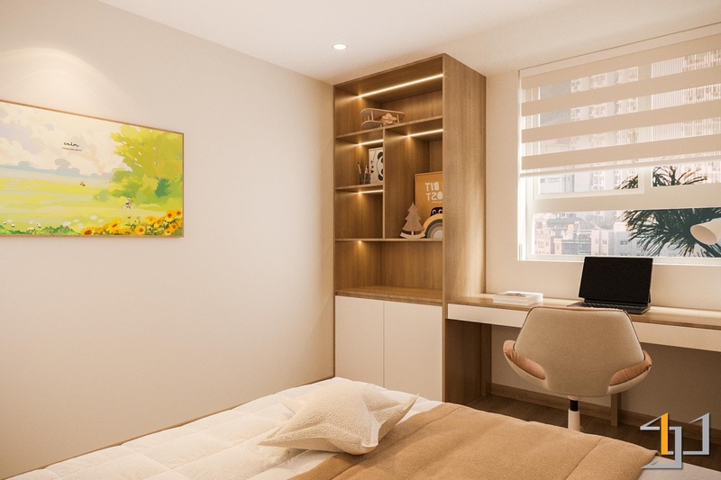 Hai phòng ngủ ưu tiên sự yên tĩnh với bố cục gọn, hệ tủ âm và màu nền trầm nhẹ nhằm giữ nhịp nghỉ ngơi ổn định. Góc làm việc được tích hợp trong mảng gỗ sáng, đủ tập trung mà không chiếm diện tích. Toàn bộ không gian hướng đến nhịp sống an hòa: tối giản, mạch lạc và bền vững – đúng tinh thần Thổ làm trọng tâm.