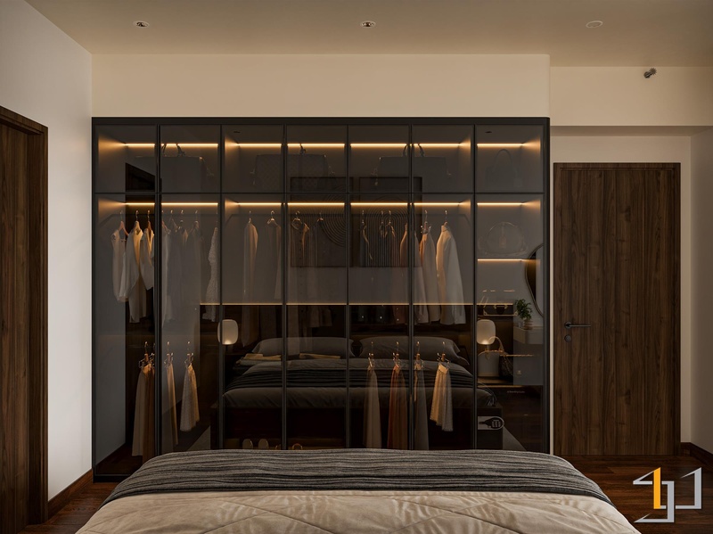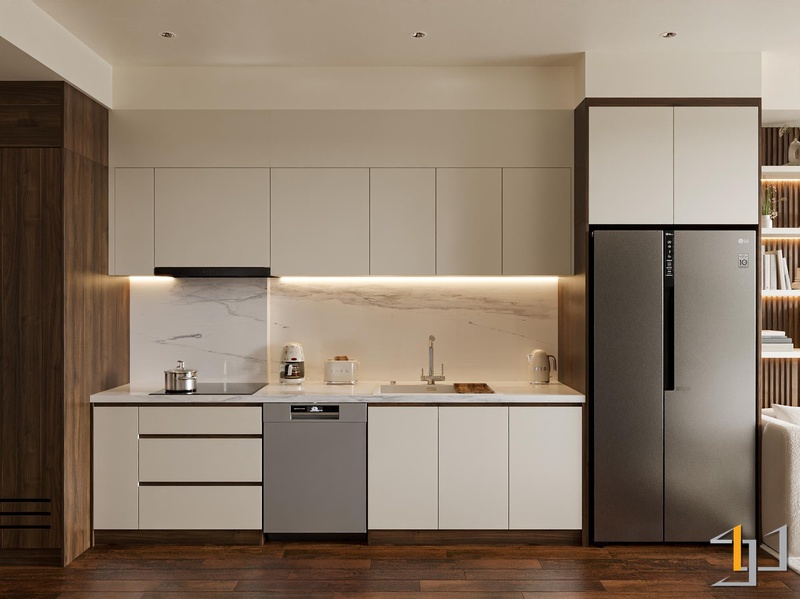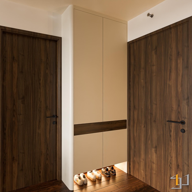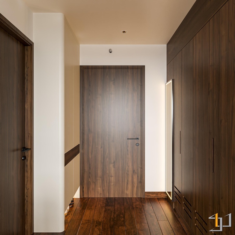 Gam màu be ấm, nâu đất, ghi trung tính kết hợp cùng gỗ công nghiệp vân mịn, bề mặt lì và ánh sáng vàng dịu tạo nên một lớp nền trầm ổn cho toàn bộ không gian. Những vật liệu này không phô trương, nhưng đủ dày để mang lại cảm giác chắc chắn, êm và dễ ở.