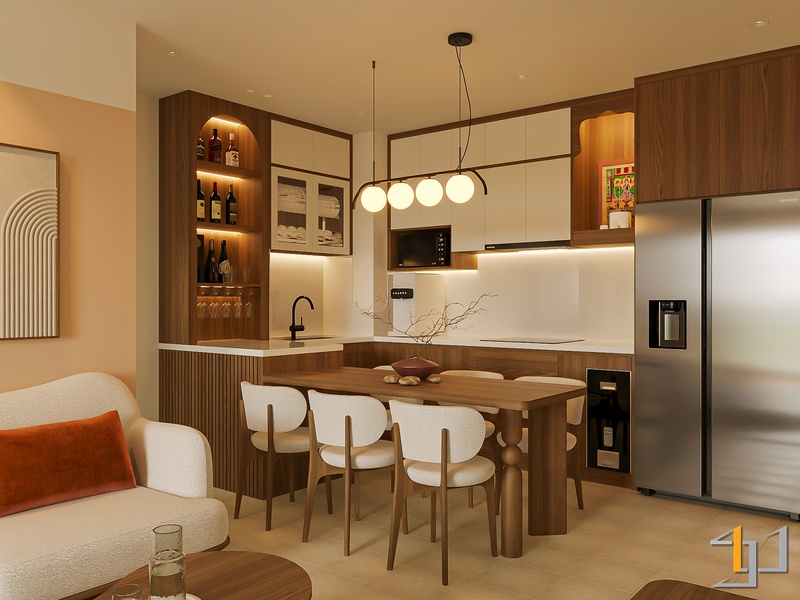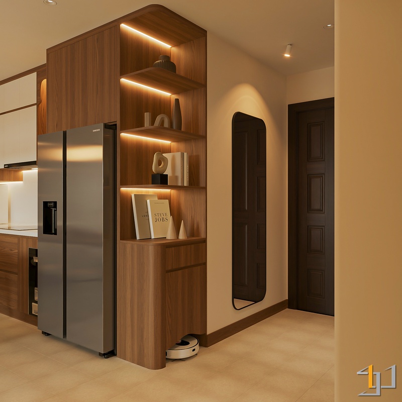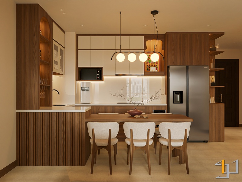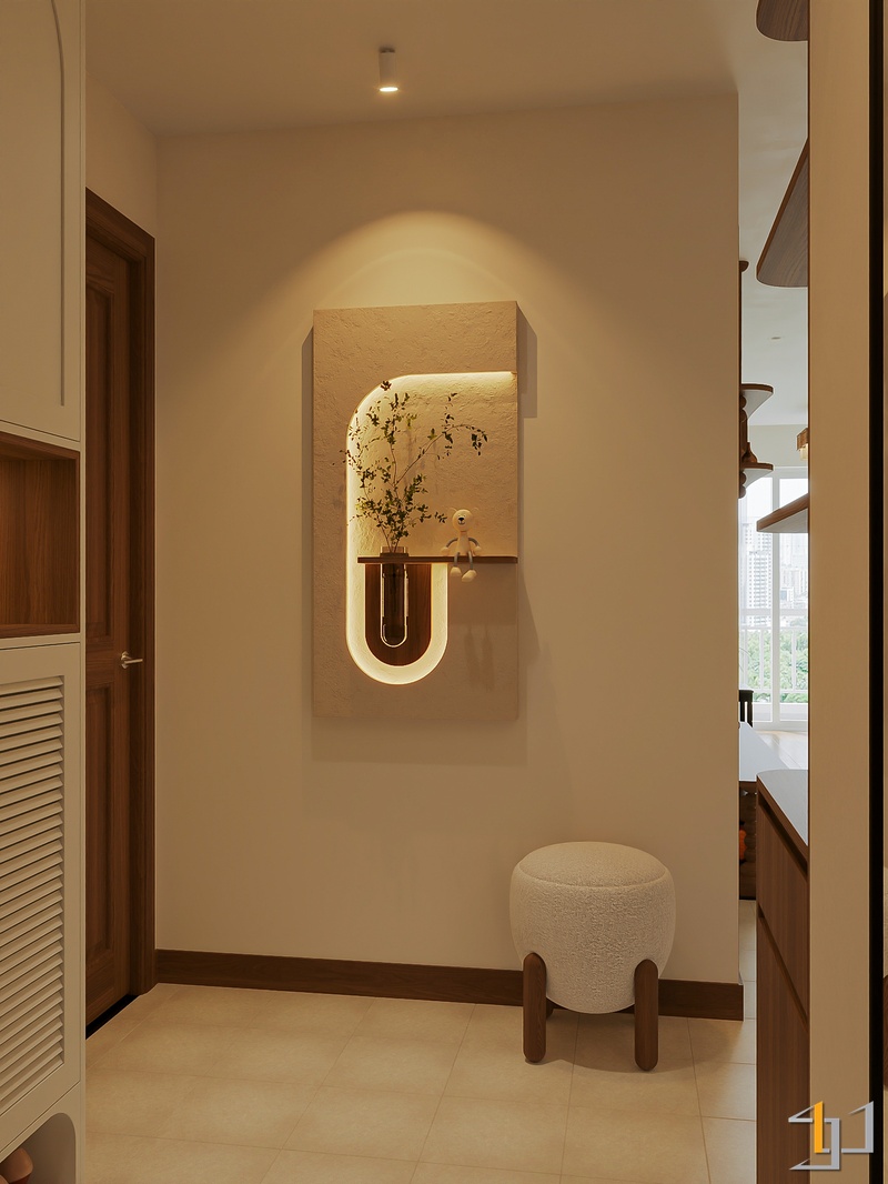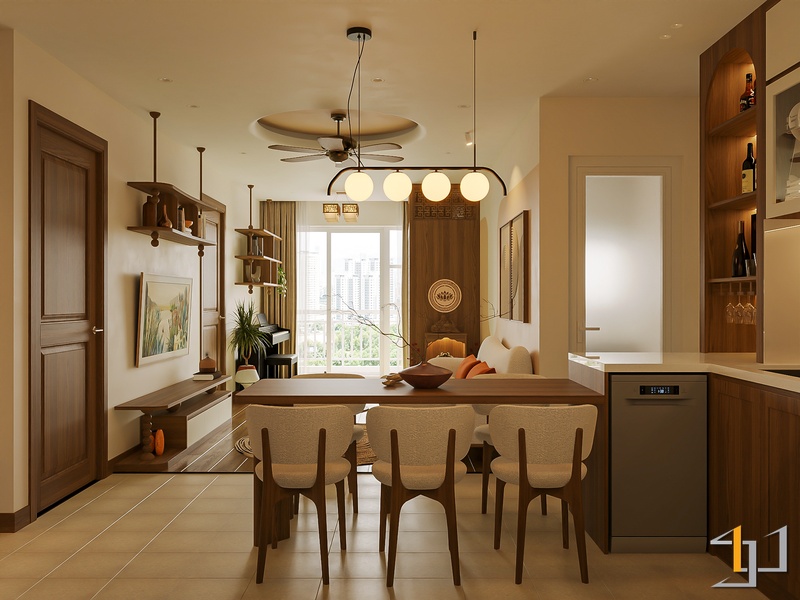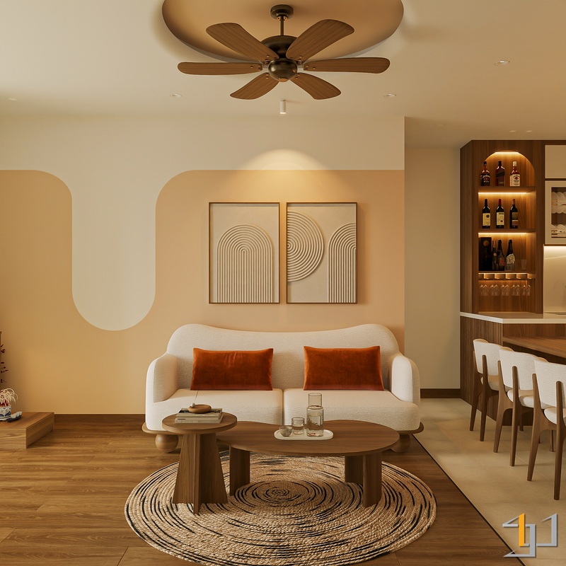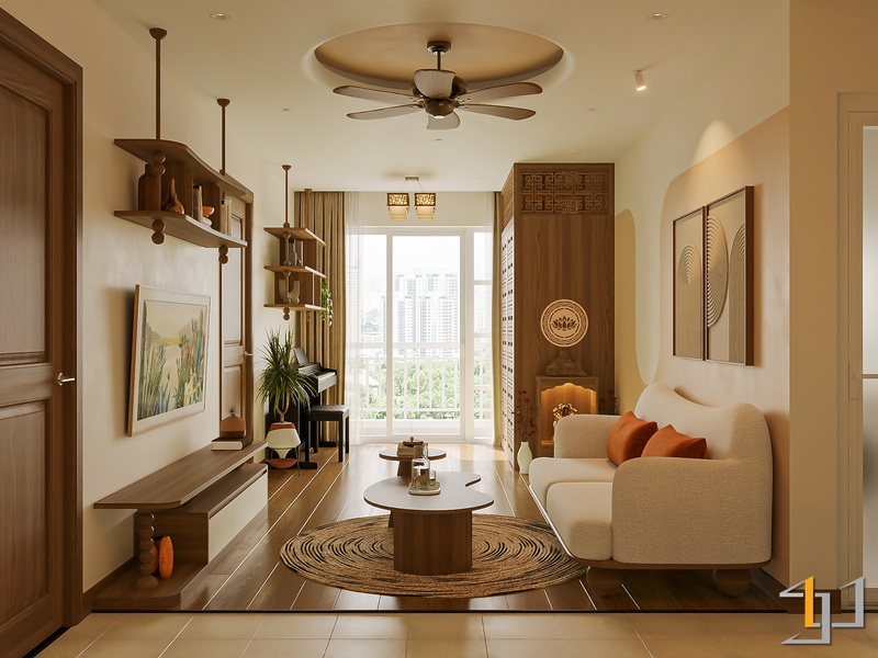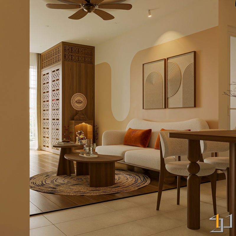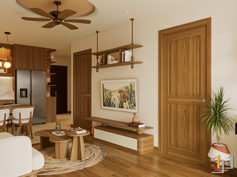 Không gian được phát triển theo tinh thần Mộc sinh khí – nơi vật liệu gỗ trở thành sợi dây kết nối toàn bộ căn hộ. Tông gỗ sồi sáng kết hợp walnut trầm tạo nên nền ấm áp, đi cùng các bề mặt sơn hiệu ứng nhám nhẹ và những đường cong thạch cao mềm giúp tổng thể trở nên nhẹ nhàng, gần gũi.