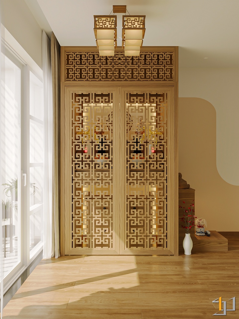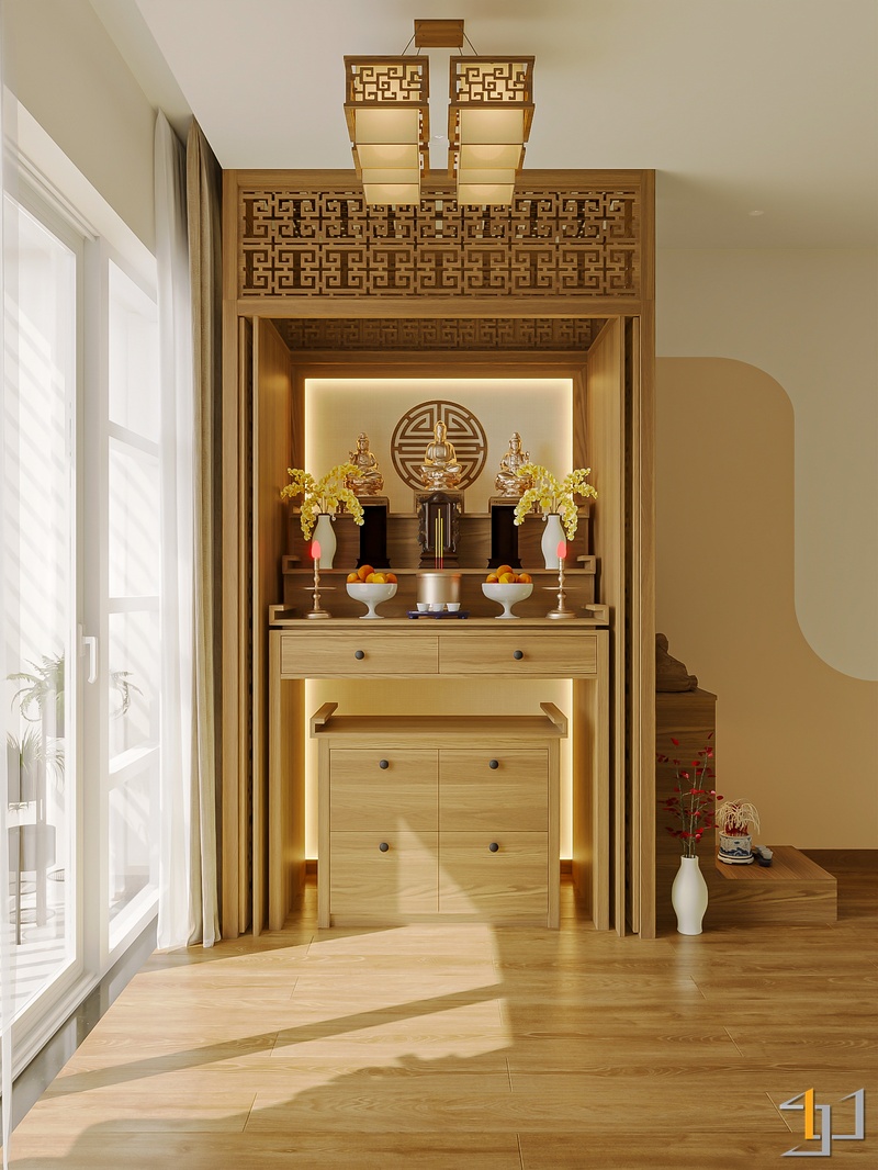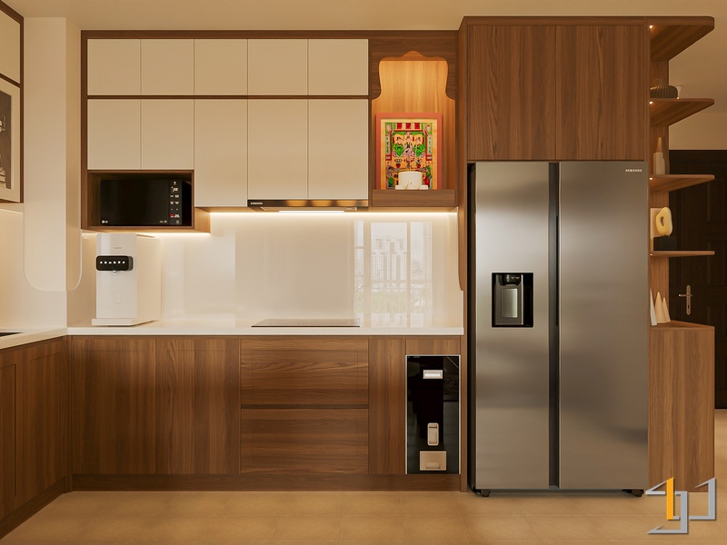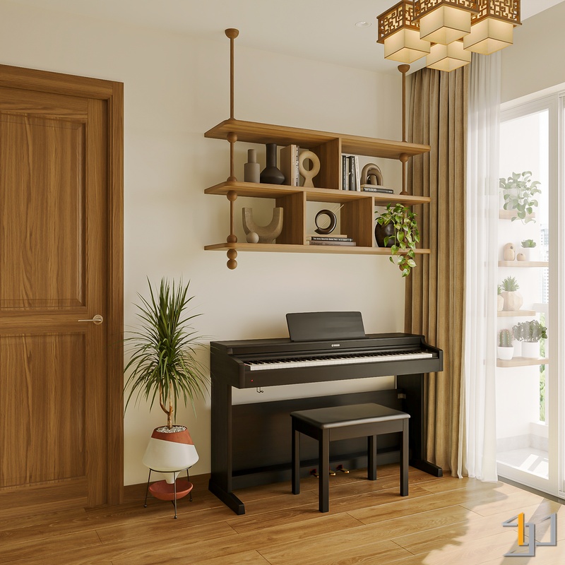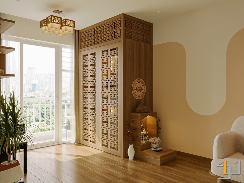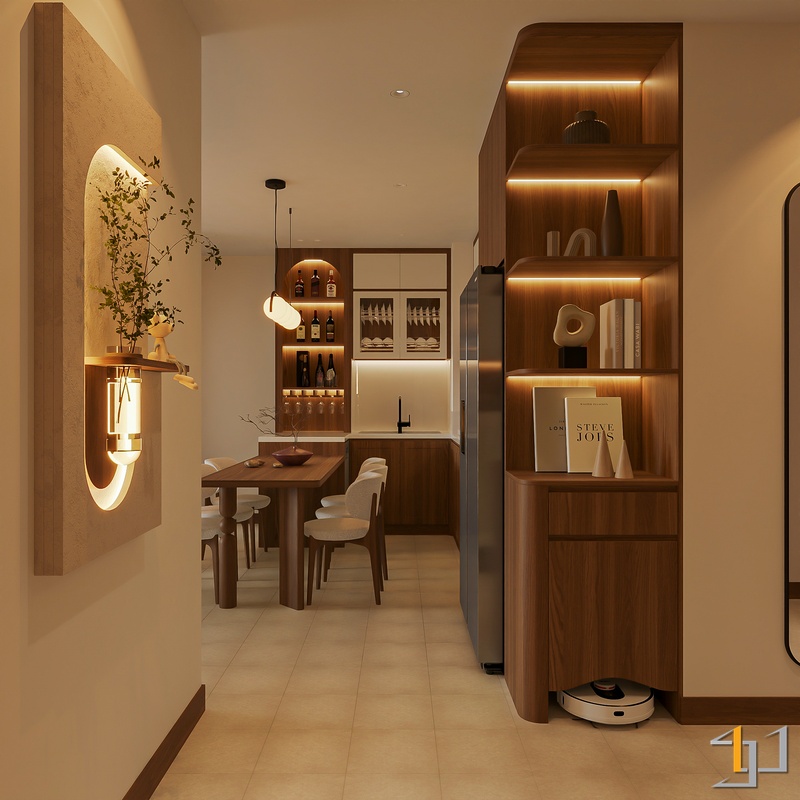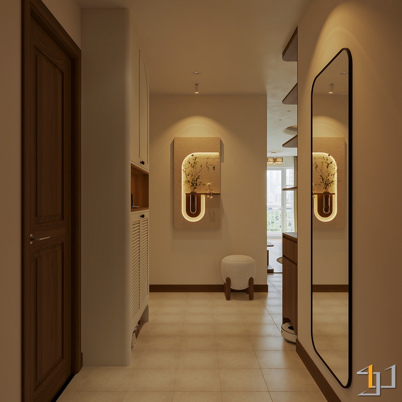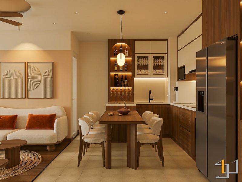 Không gian được phát triển theo tinh thần Mộc sinh khí – nơi vật liệu gỗ trở thành sợi dây kết nối toàn bộ căn hộ. Tông gỗ sồi sáng kết hợp walnut trầm tạo nên nền ấm áp, đi cùng các bề mặt sơn hiệu ứng nhám nhẹ và những đường cong thạch cao mềm giúp tổng thể trở nên nhẹ nhàng, gần gũi.