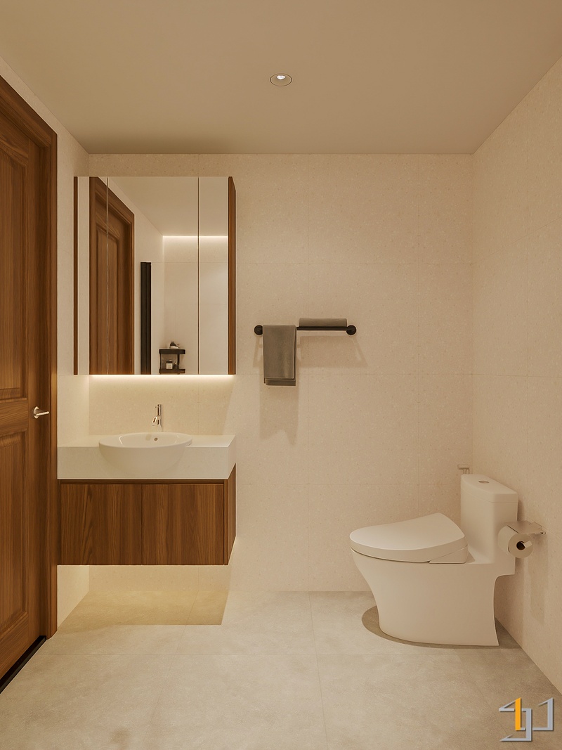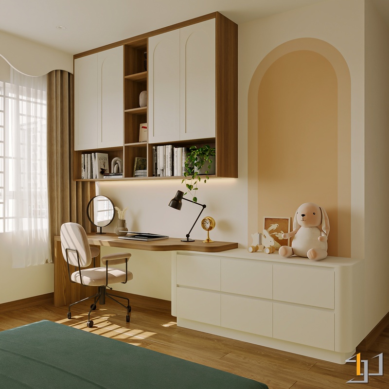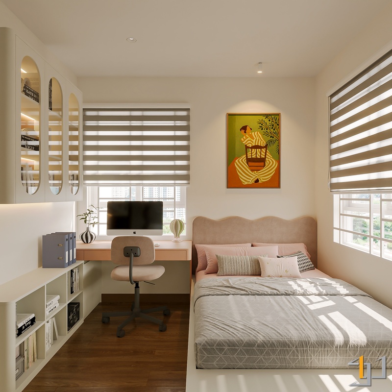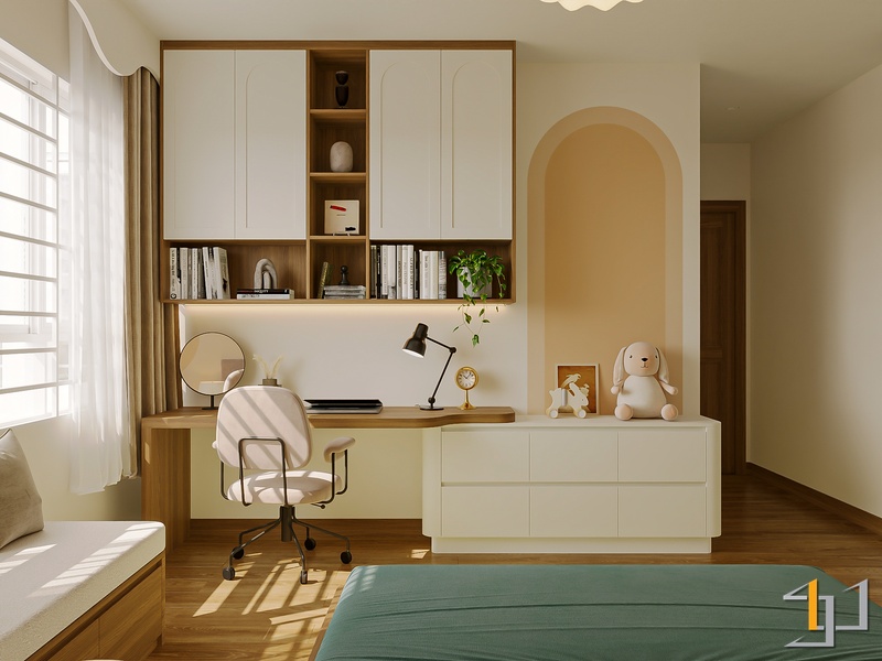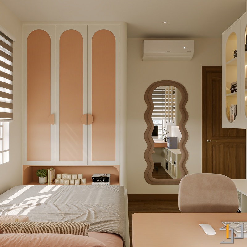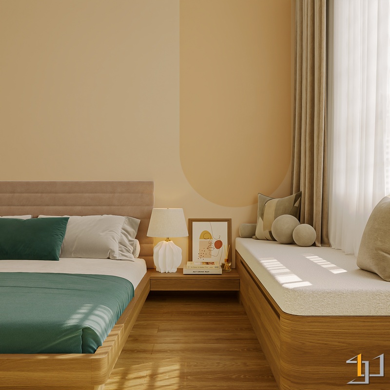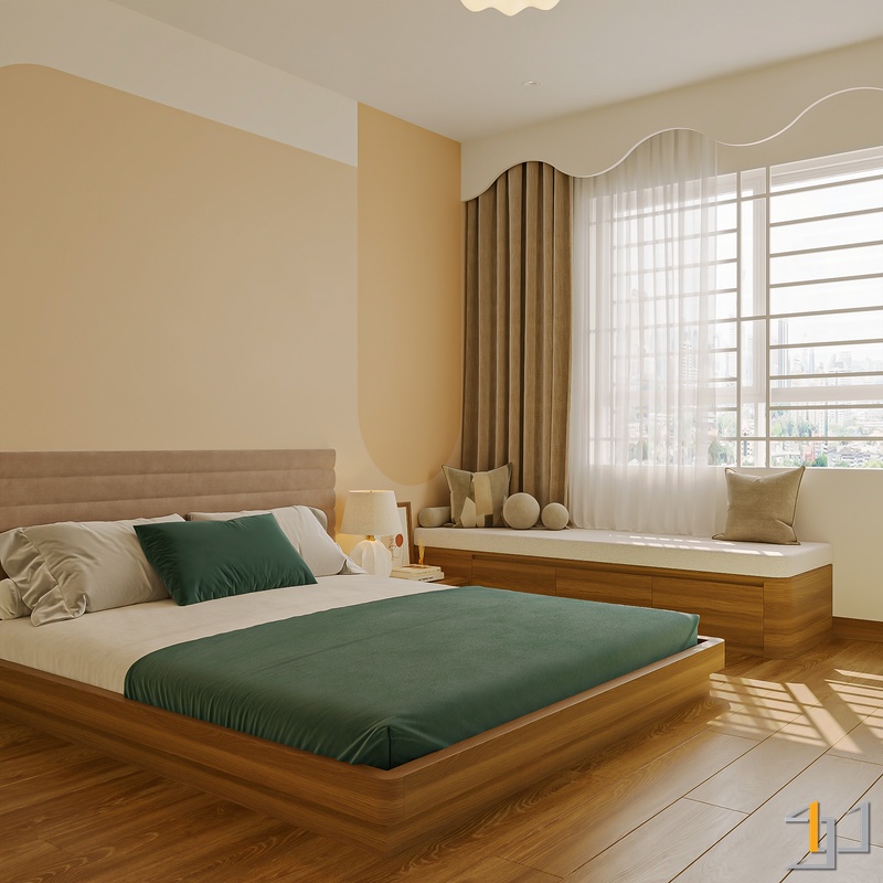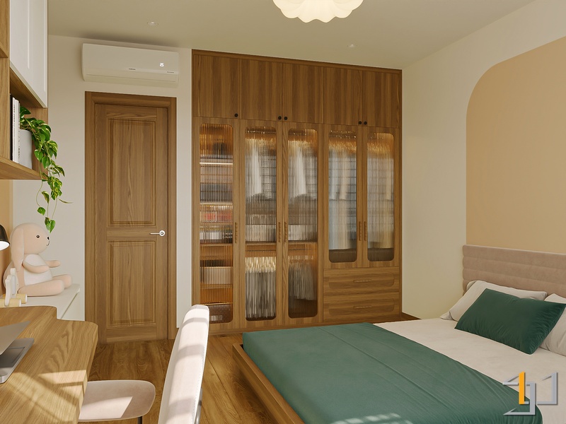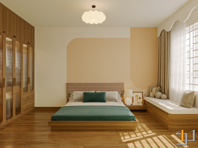 Ngôn ngữ thiết kế hướng đến Modern Minimal – Japandi – Scandinavian, vì vậy nội thất được tiết chế, tập trung vào công năng và cảm giác sống lâu dài. Hệ tủ kịch trần, giường bục kết hợp lưu trữ và các mảng nan gỗ trang trí giúp không gian gọn gàng nhưng vẫn có chiều sâu.