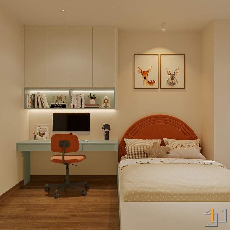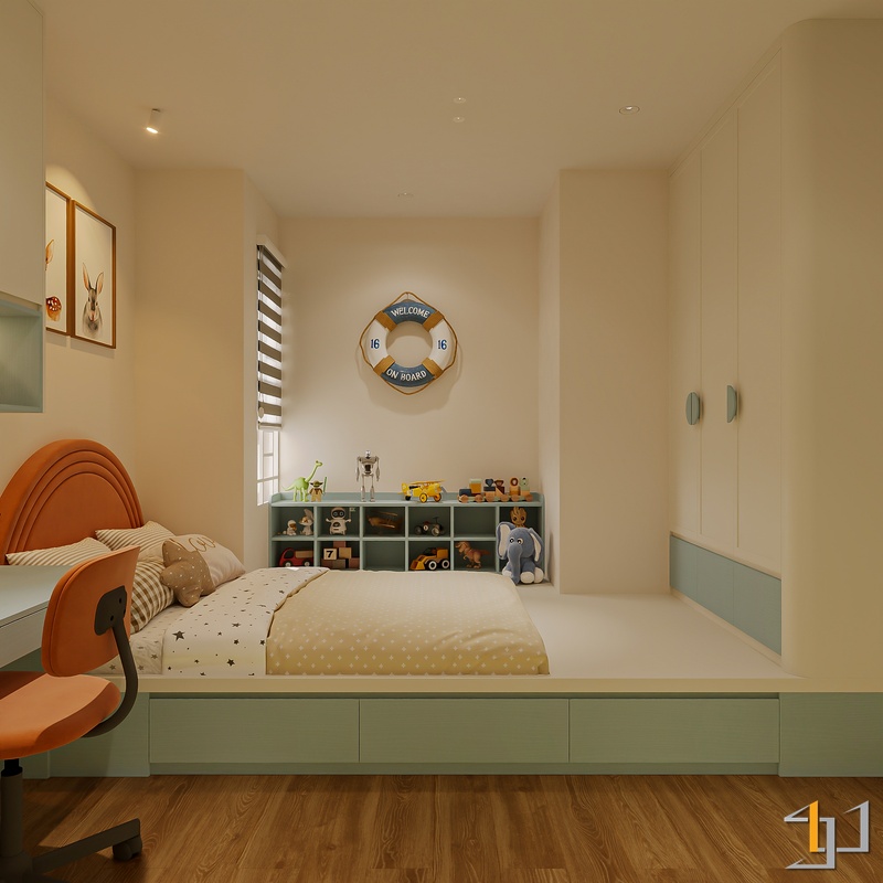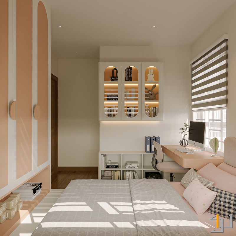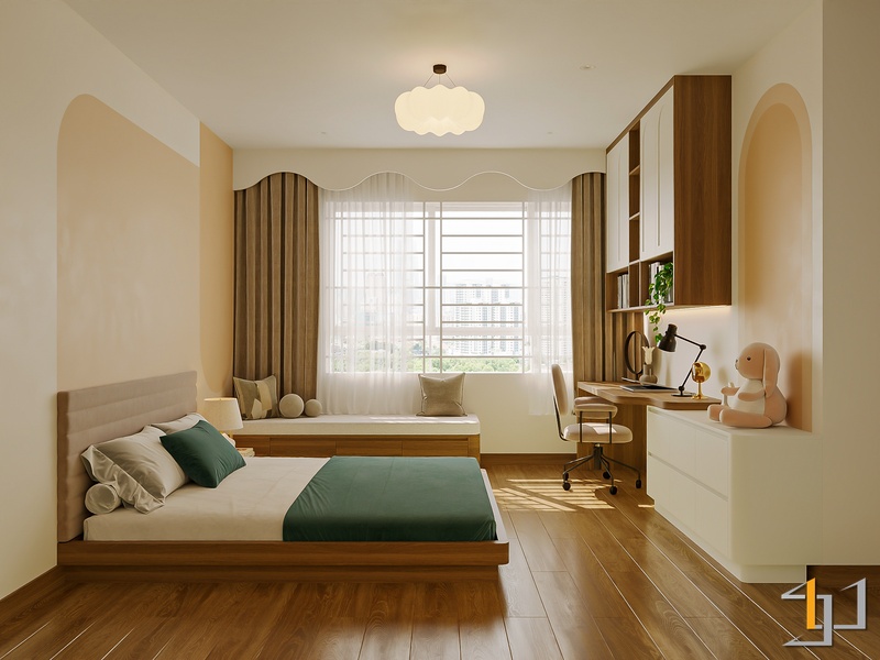 Các lớp vật liệu vải thô, thảm mềm cùng ánh sáng LED vàng ấm tạo nên bầu không khí thư giãn. Điểm nhấn cam đất, xanh mint trong phòng trẻ nhỏ mang lại nhịp sống sinh động nhưng vẫn giữ sự hài hòa tổng thể.