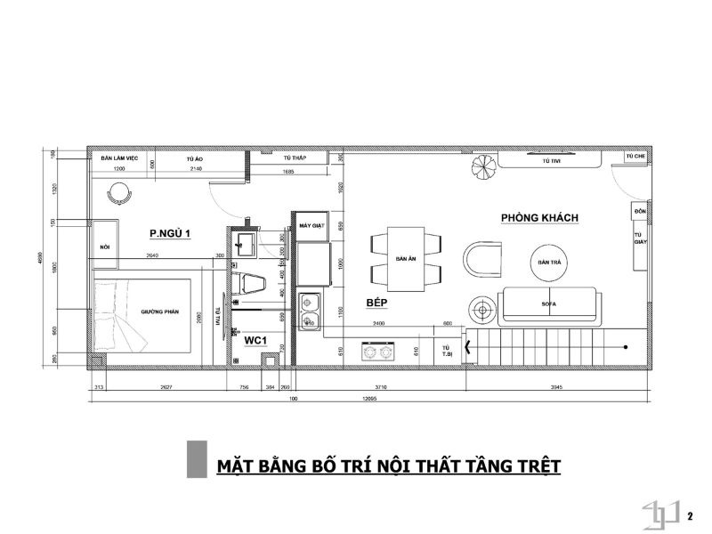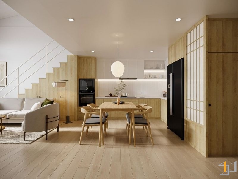 Tầng trệt được tổ chức mở, kết nối liền mạch phòng khách – bếp – bàn ăn, giúp ánh sáng tự nhiên lan tỏa tới mọi góc nhỏ. Kết cấu lệch tầng tạo cảm giác rộng thoáng hơn, đồng thời phân chia các khu vực sinh hoạt một cách hợp lý mà vẫn đảm bảo sự kết nối.