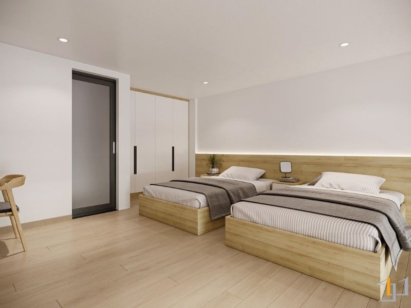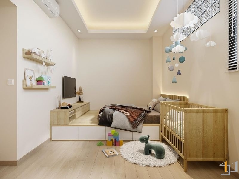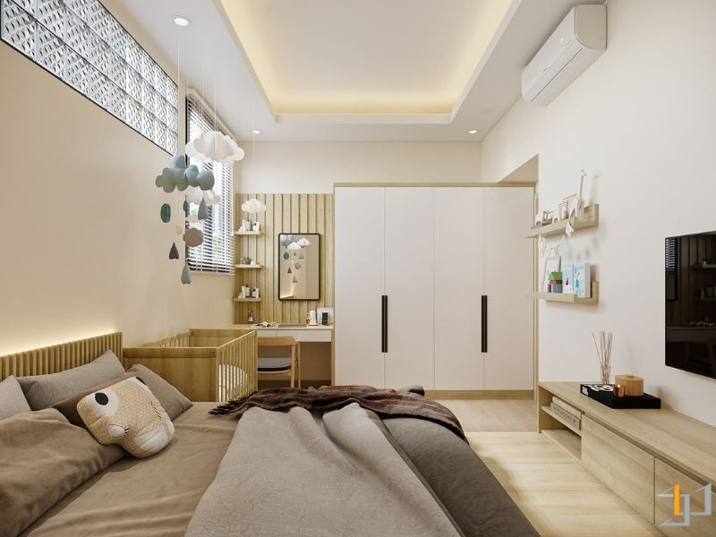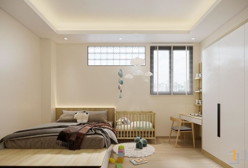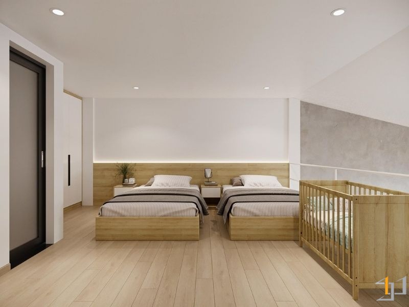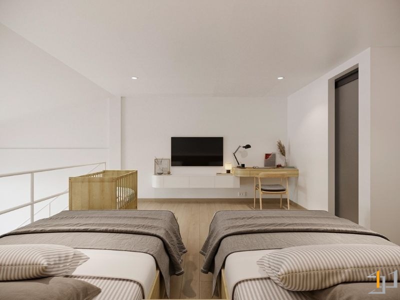 Trên tầng lửng, khu nghỉ ngơi được bố trí như một “tổ ấm nhỏ” trên cao, riêng tư vừa đủ và kết nối hài hòa nhờ lan can trắng thanh thoát. Tỉ lệ, chất liệu và ánh sáng được xử lý cân bằng, mang đến một không gian gọn gàng, mộc mạc và tràn đầy năng lượng tích cực – nơi gia chủ luôn cảm nhận được sự bình yên mỗi khi trở về.