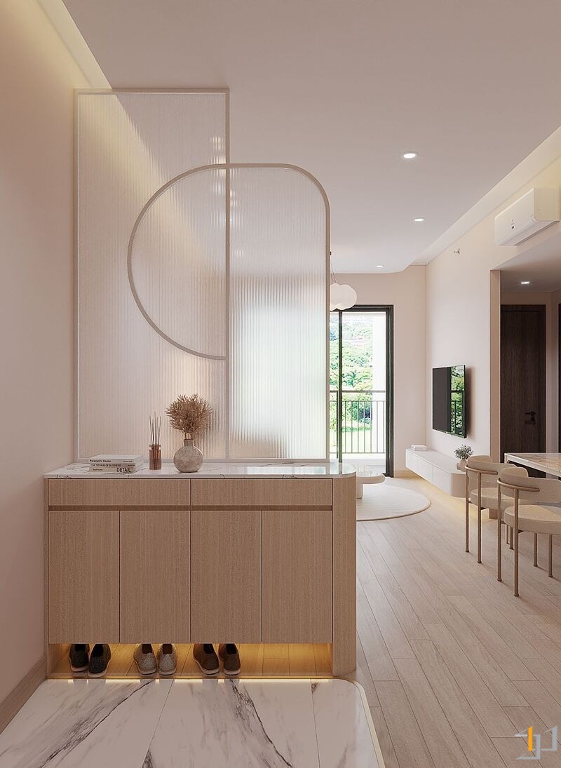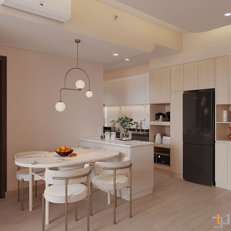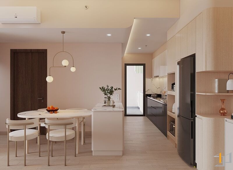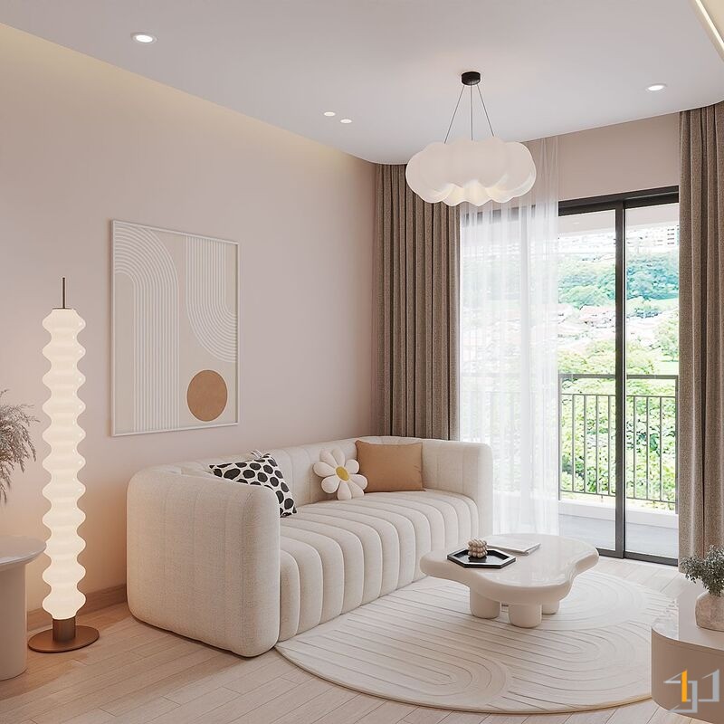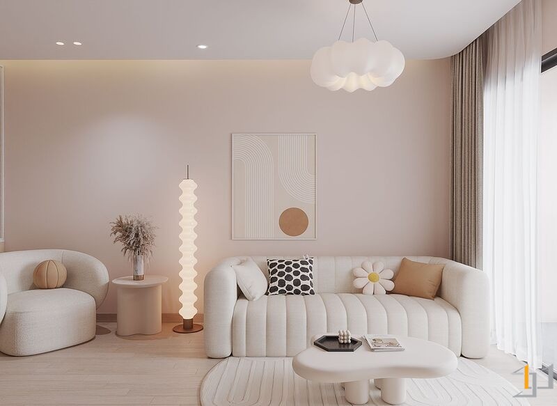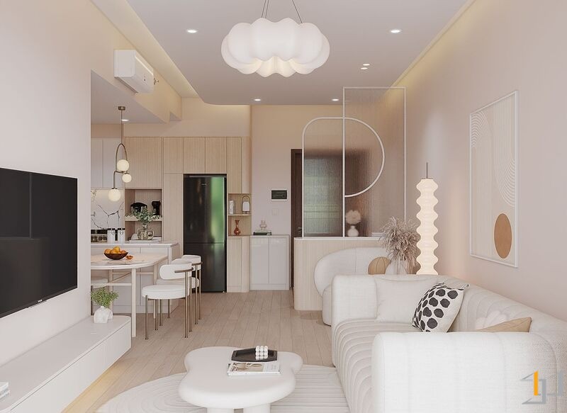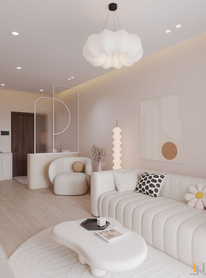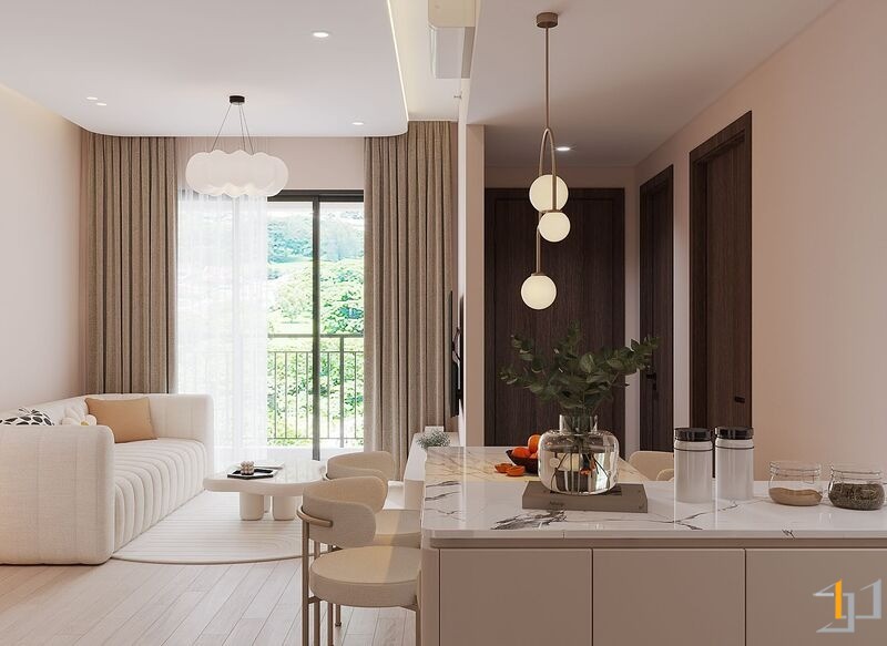 Căn hộ là một không gian sống ấm cúng, nhẹ nhàng và thanh lịch. Toàn bộ căn hộ được bố trí mở ở khu vực sinh hoạt chung, kết nối phòng khách với ban công đón ánh sáng tự nhiên tối đa, khu vực bếp và bàn ăn được phân chia tinh tế bằng bàn đảo và sự khác biệt về vật liệu. Nội thất sử dụng các hình khối cong, bo tròn mềm mại (sofa, bàn trà, đèn trang trí) để tăng tính thẩm mỹ và sự thư giãn.
