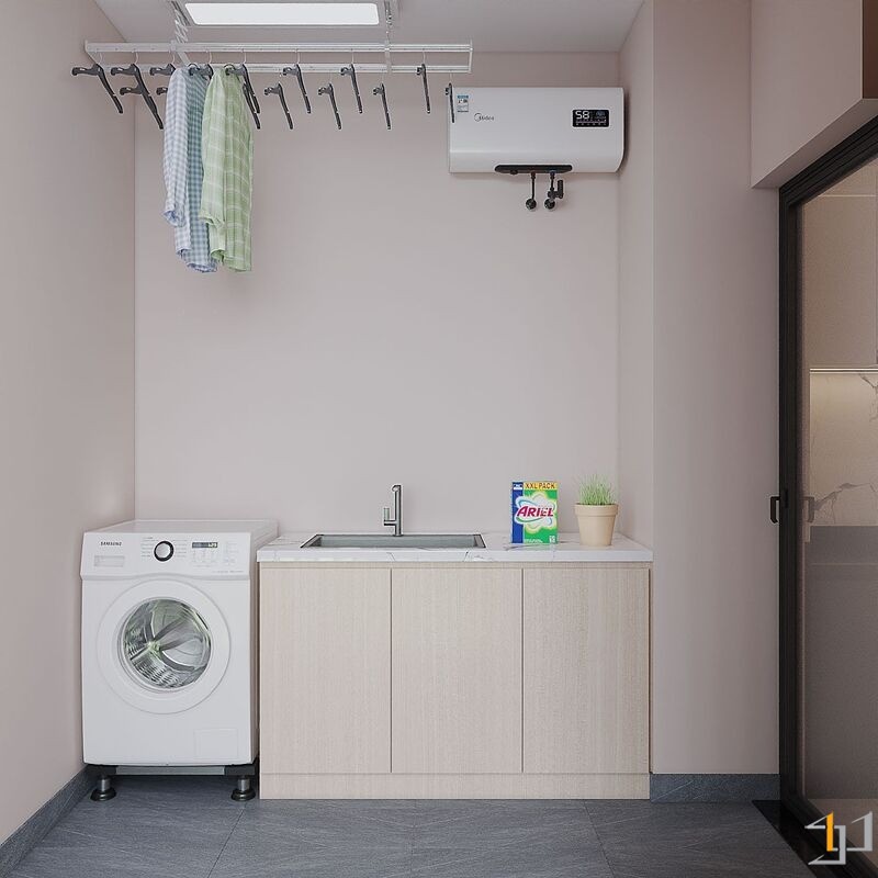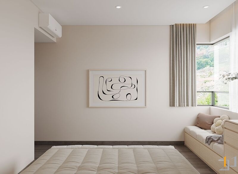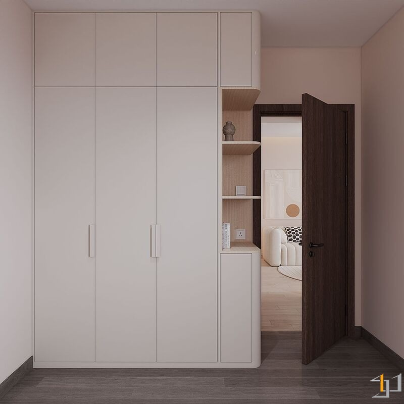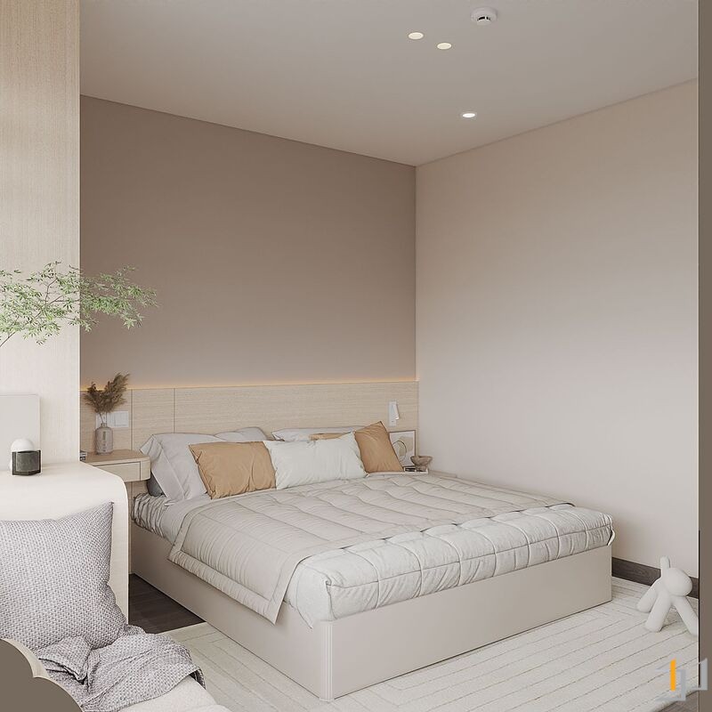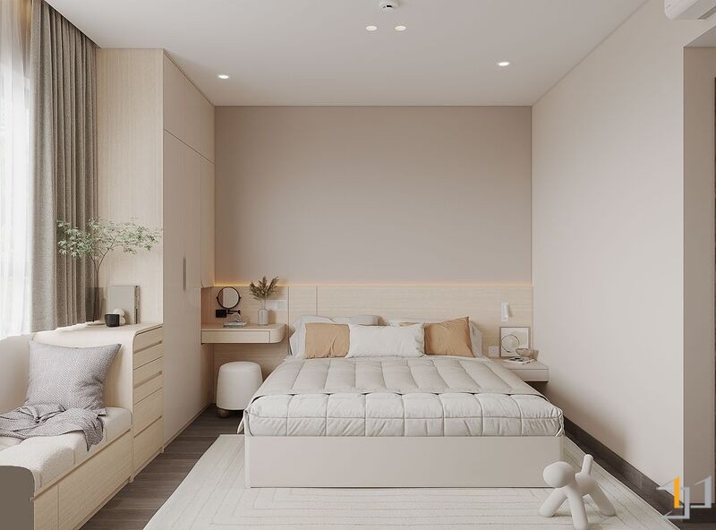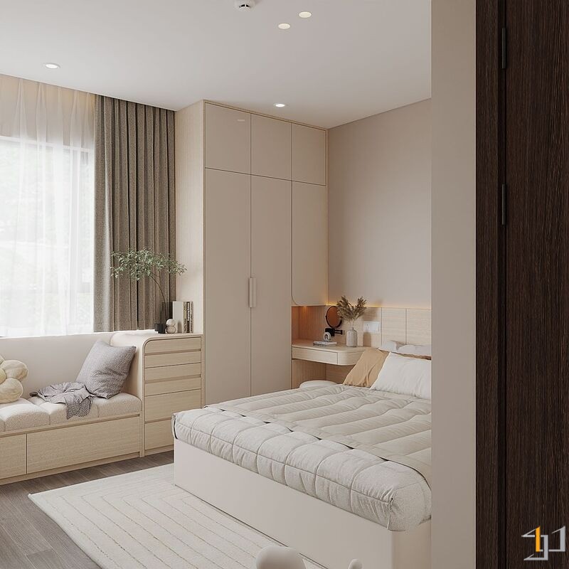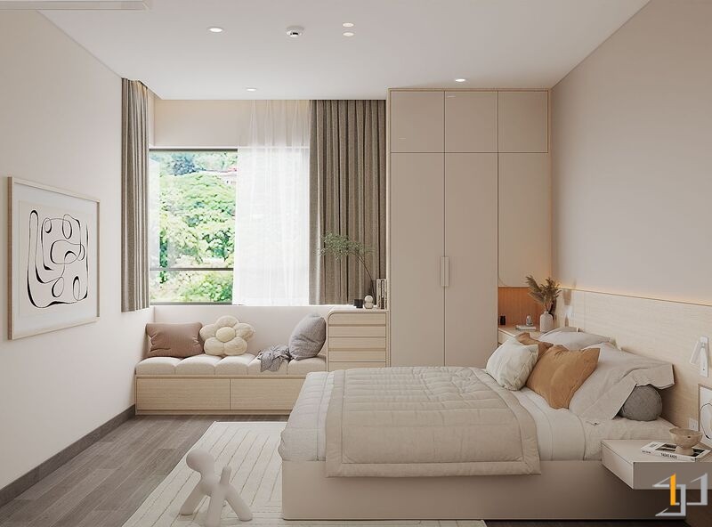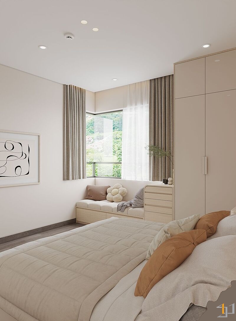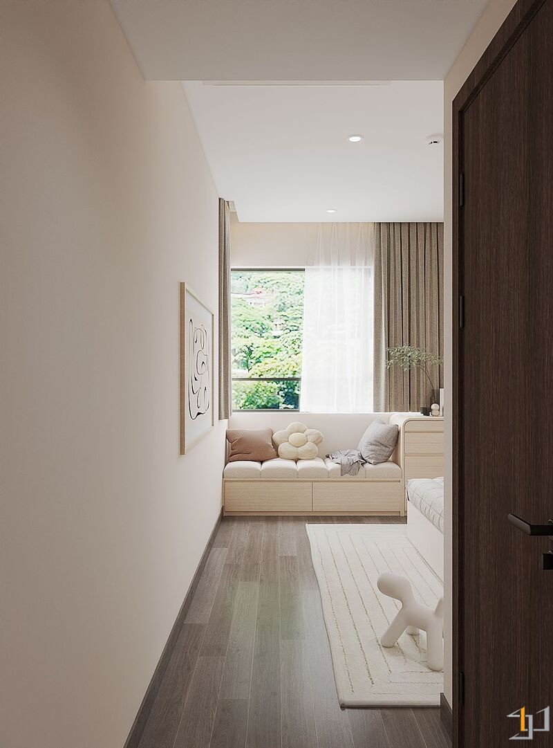 Căn hộ là một không gian sống ấm cúng, nhẹ nhàng và thanh lịch. Toàn bộ căn hộ được bố trí mở ở khu vực sinh hoạt chung, kết nối phòng khách với ban công đón ánh sáng tự nhiên tối đa, khu vực bếp và bàn ăn được phân chia tinh tế bằng bàn đảo và sự khác biệt về vật liệu. Nội thất sử dụng các hình khối cong, bo tròn mềm mại (sofa, bàn trà, đèn trang trí) để tăng tính thẩm mỹ và sự thư giãn.