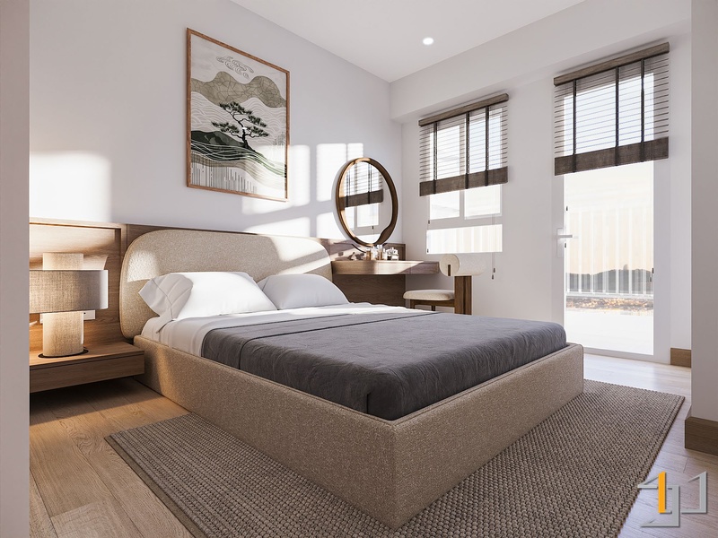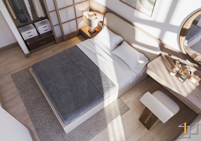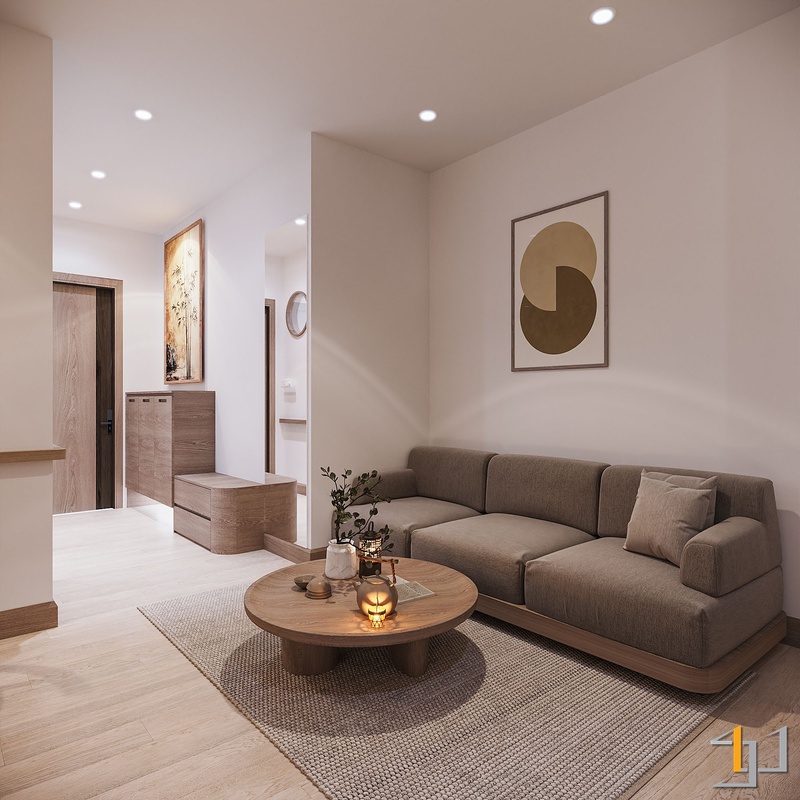Căn hộ 1 phòng ngủ được định hình theo phong cách Nhật Bản thuần chất, đề cao sự tĩnh tại, tối giản và tính bền vững trong vật liệu. Tổng thể không gian xoay quanh bảng màu gỗ sáng – beige – trắng kem, tạo nền ấm áp và ổn định, đúng tinh thần Thổ Vững Chãi.