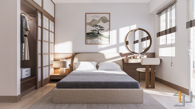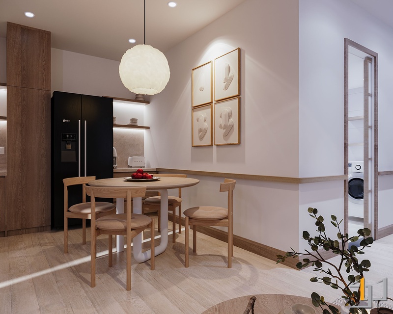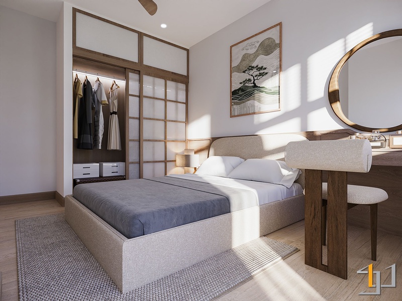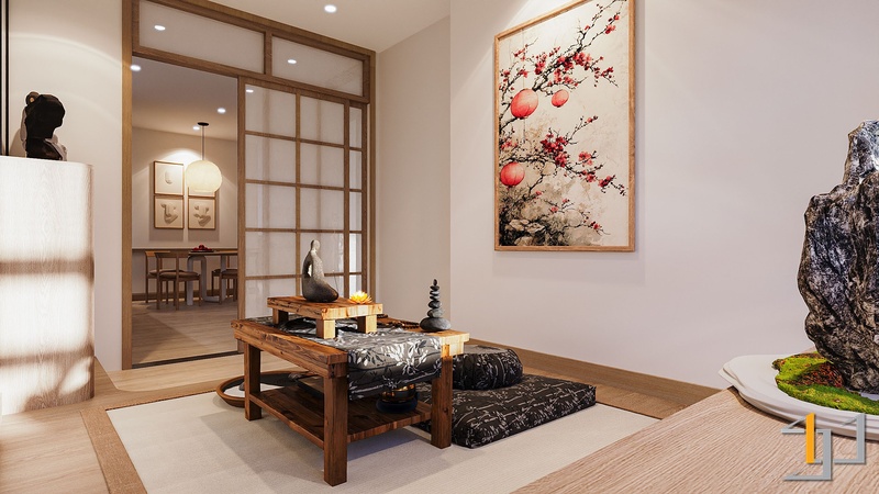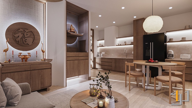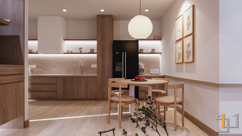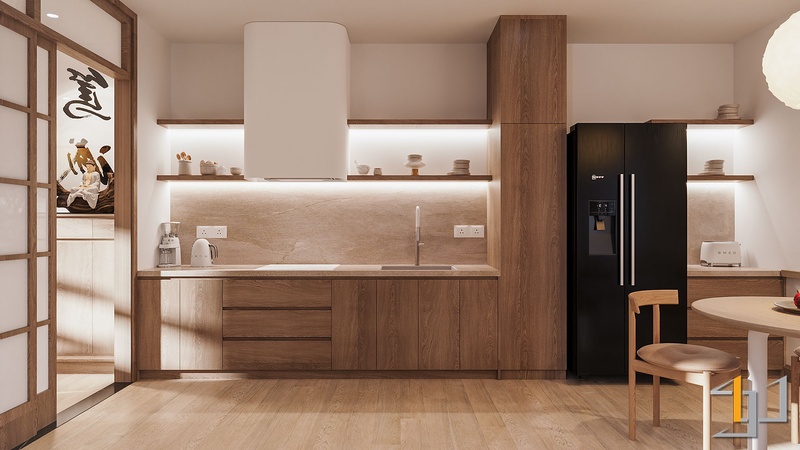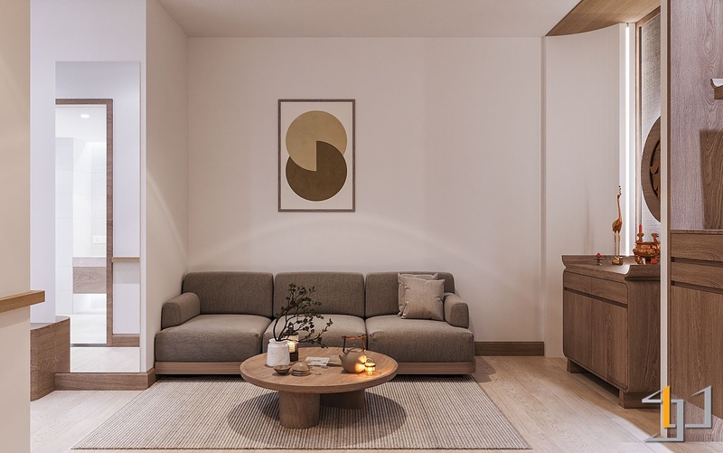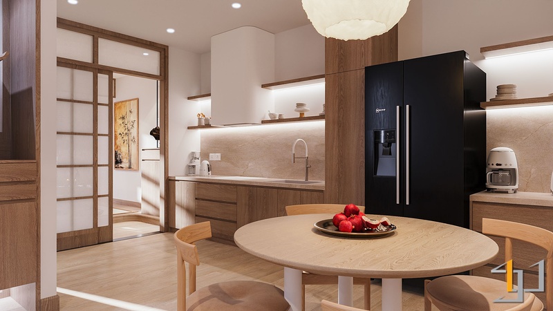 Gỗ là vật liệu chủ đạo, xuất hiện xuyên suốt từ sàn, hệ tủ đến nội thất rời. Tông gỗ sồi sáng với vân mịn tự nhiên mang lại cảm giác mộc mạc nhưng tinh tế. Cửa lùa Shoji khung gỗ kết hợp pano trắng giúp phân tách không gian nhẹ nhàng, đồng thời giữ được ánh sáng xuyên suốt. Hệ tủ bếp, tủ thờ và các chi tiết bo góc tròn mềm tạo nên sự chỉn chu, tiết chế.