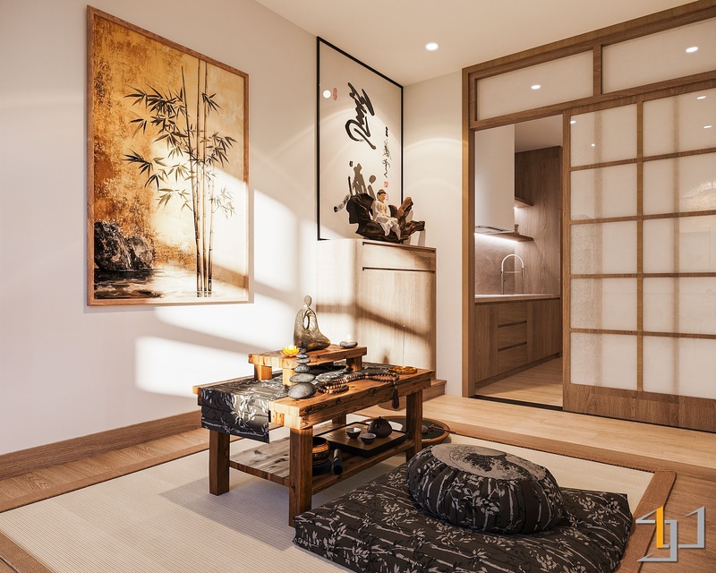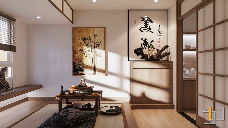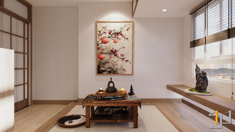 Mảng tường đầu giường và vách thờ sử dụng bề mặt giả vải tông beige, tăng chiều sâu thị giác. Khu trà đạo trải chiếu Tatami sợi tự nhiên, giữ trọn tinh thần truyền thống.