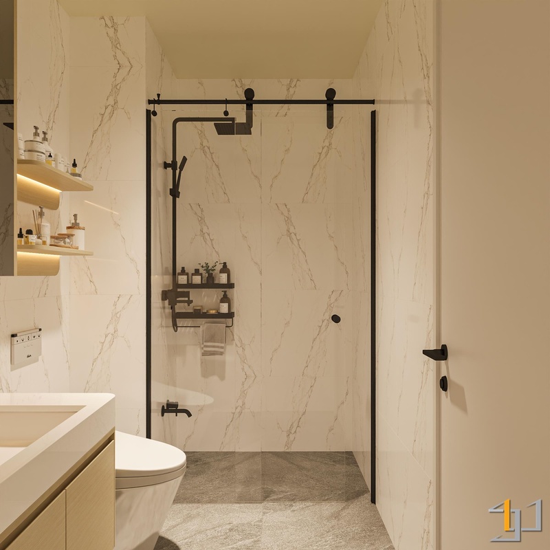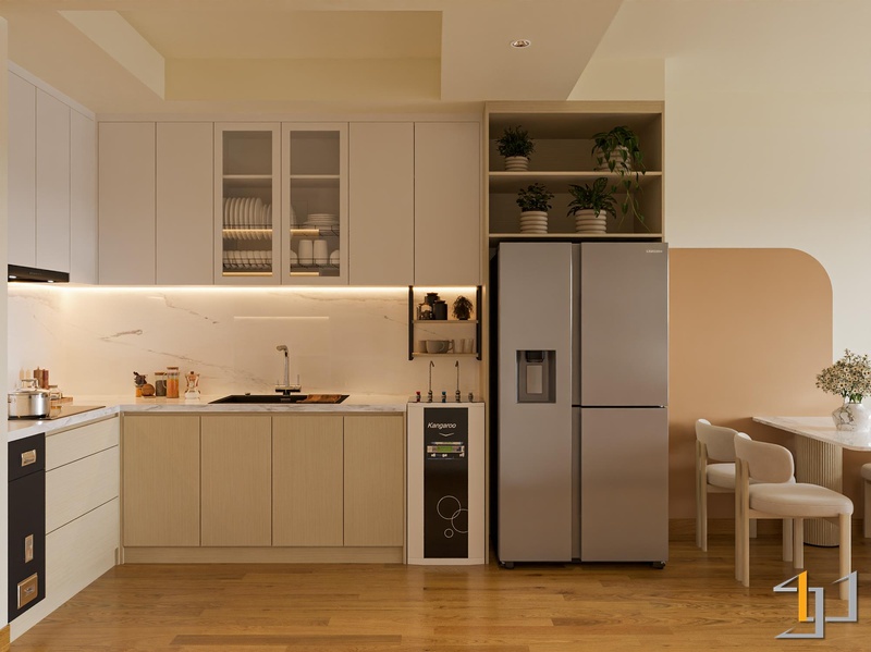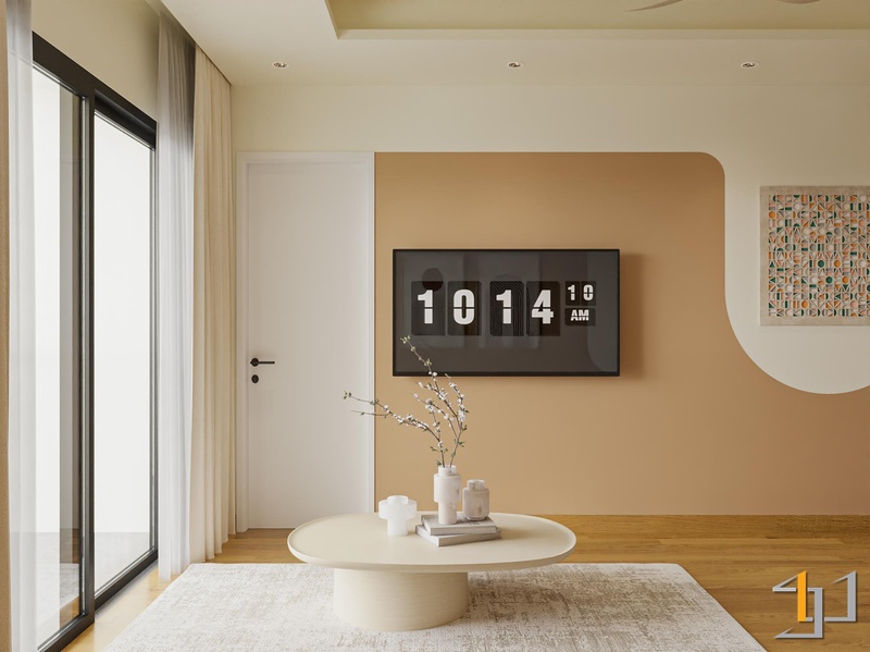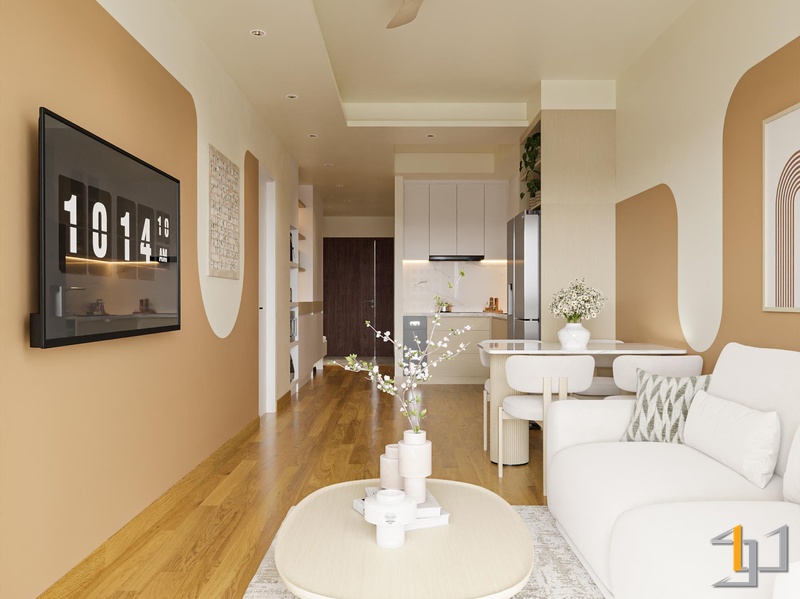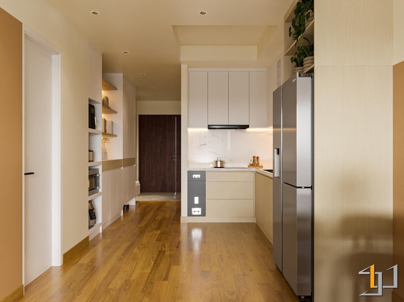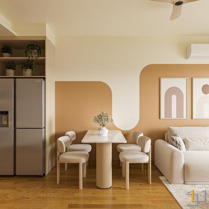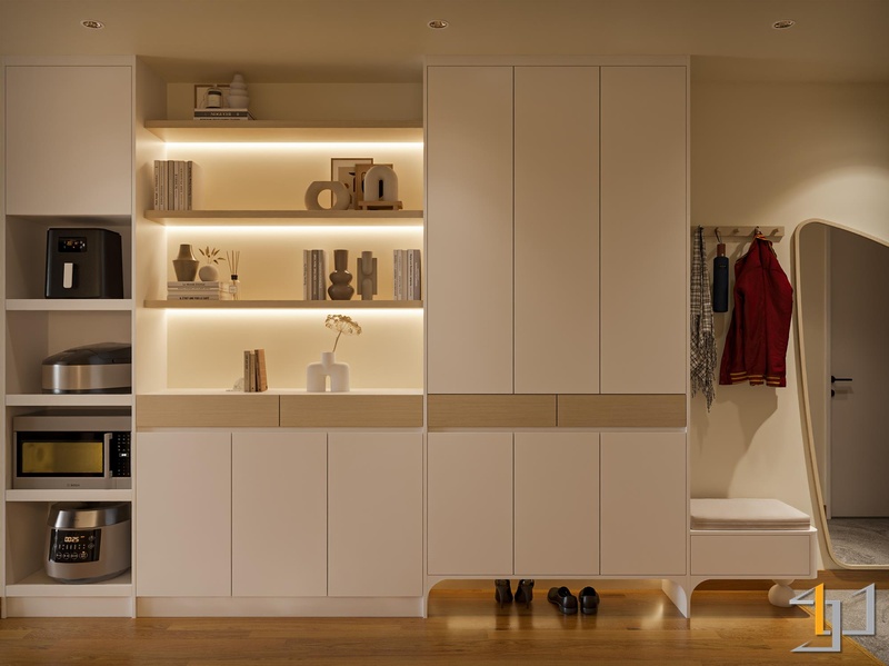 Bố cục được tổ chức mạch lạc, ưu tiên sự gọn gàng và liên kết thị giác. Các khu vực chức năng phân định bằng tỷ lệ, cao độ và vật liệu thay vì tường cứng, giữ cho không gian liền mạch nhưng vẫn rõ ràng công năng. Hệ tủ phẳng, tay nắm âm và các mảng bo cong nhẹ giúp giảm cảm giác cứng, tăng sự thư thái đặc trưng của Japandi.