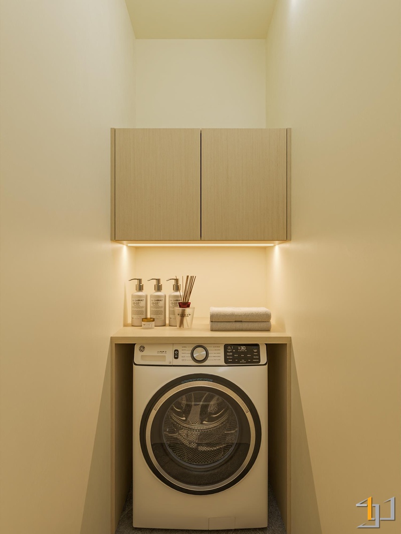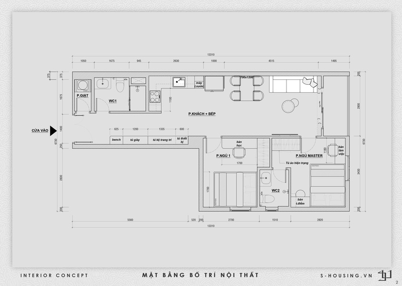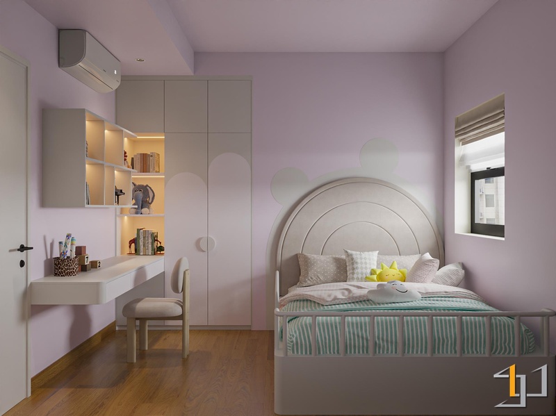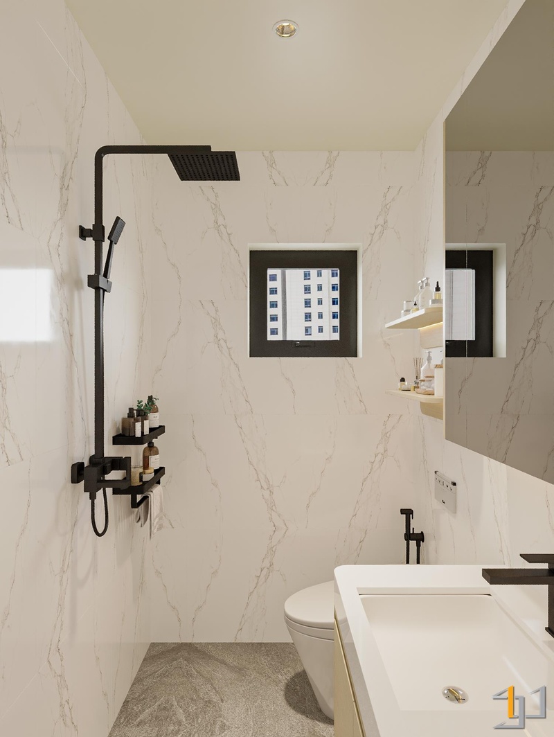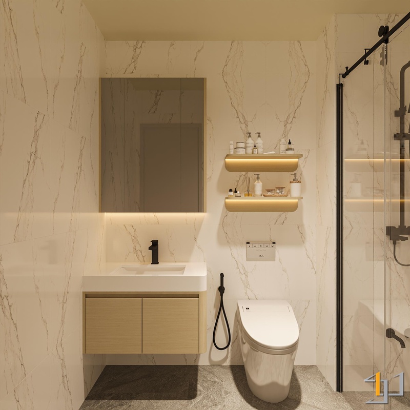 Bố cục được tổ chức mạch lạc, ưu tiên sự gọn gàng và liên kết thị giác. Các khu vực chức năng phân định bằng tỷ lệ, cao độ và vật liệu thay vì tường cứng, giữ cho không gian liền mạch nhưng vẫn rõ ràng công năng. Hệ tủ phẳng, tay nắm âm và các mảng bo cong nhẹ giúp giảm cảm giác cứng, tăng sự thư thái đặc trưng của Japandi.