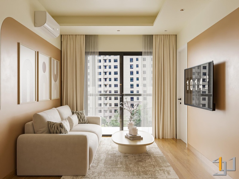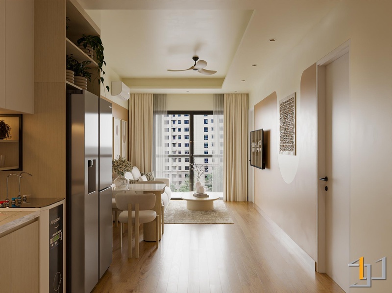 Không gian được định hình theo phong cách Japandi, đặt trọng tâm vào Thổ Vững Chãi để tạo cảm giác ổn định, ấm và dễ an trú ngay từ trải nghiệm đầu tiên. Tổng thể sử dụng bảng màu be – nâu đất – trắng ngà, kết hợp ánh sáng vàng dịu giúp các mặt phẳng kiến trúc trở nên mềm và có chiều sâu.