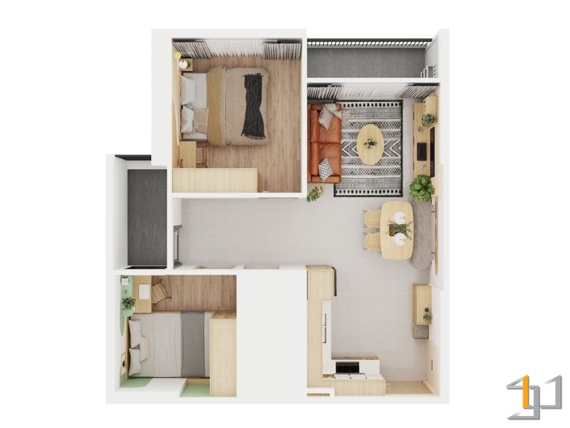 Phong cách Japandi tại căn hộ này không đi theo sự tĩnh lặng tuyệt đối, mà được chuyển hóa đầy táo bạo nhờ ngôn ngữ Hỏa Nhiệt Huyết. Trên phông nền trung tính và nội thất gỗ sồi tinh giản, giải pháp “kích hoạt” năng lượng được thực hiện thông qua những điểm nhấn màu Cam đất và Cam đào nồng nàn. Những mảng tường sơn hiệu ứng hình vòm lớn và chiếc sofa da bò màu nâu cam đóng vai trò như những “tiêu điểm” mạnh mẽ, thu hút mọi ánh nhìn và xua tan sự đơn điệu thường thấy của chủ nghĩa tối giản.