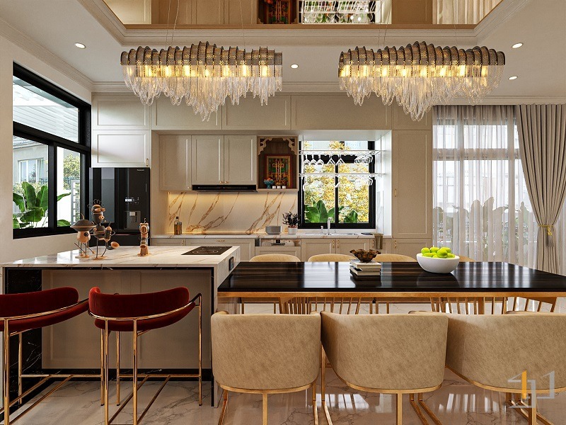 - Sử dụng đèn thả trang trí có thiết kế cổ điển cho khu vực đảo bếp hoặc bàn ăn