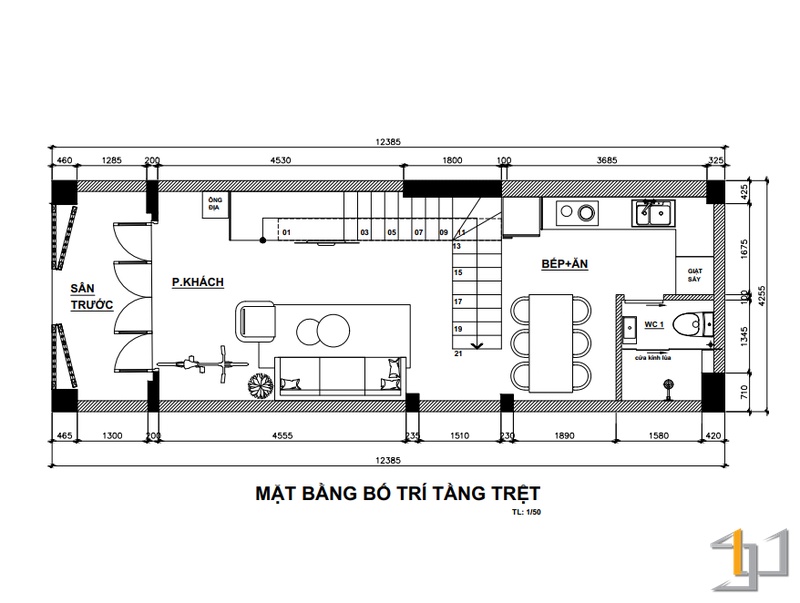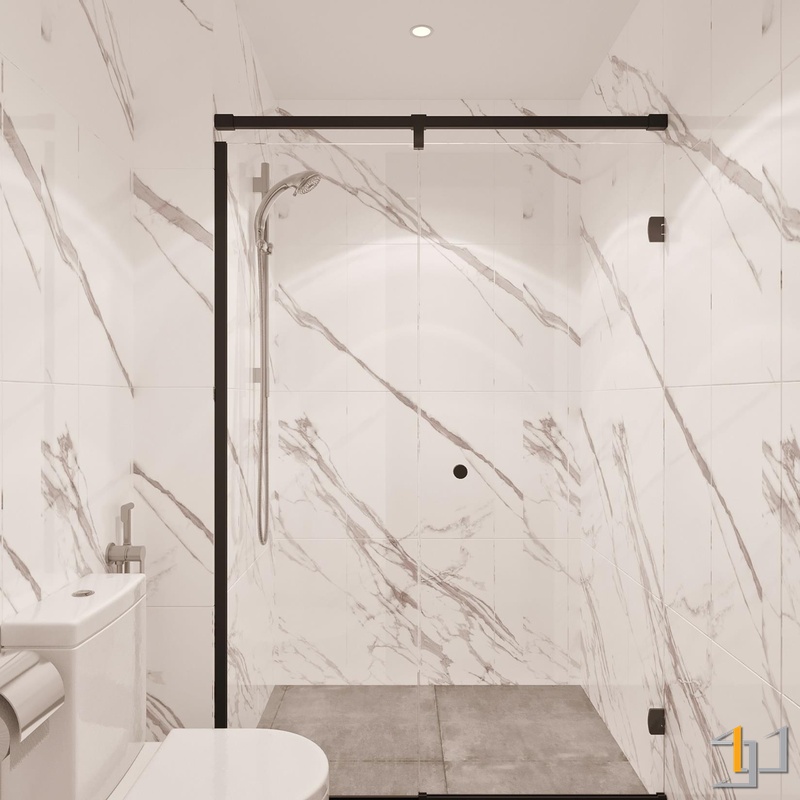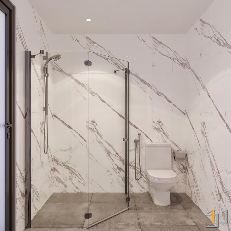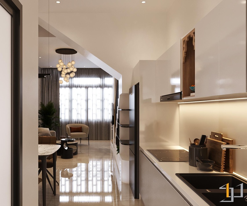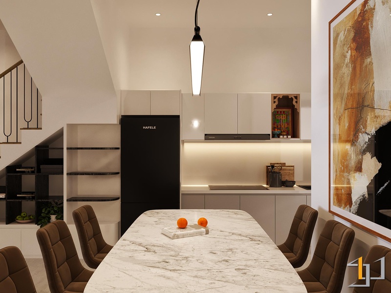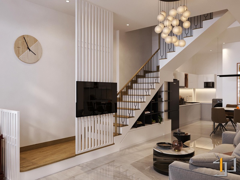 Tầng trệt giữ bố cục mở để đường di chuyển thẳng và dễ quan sát. Gam xám – trắng kết hợp bề mặt đá sáng và chi tiết kim loại tạo cảm giác gọn, rõ ràng và đúng tính Kim: sạch, sắc nét và dễ kiểm soát. Cầu thang xử lý thẳng, lam tối màu giúp ánh sáng đi đều và giữ bố cục mạch lạc. Nội thất chọn các đường thẳng, ít chi tiết để giảm rối mắt và thuận tiện vệ sinh.