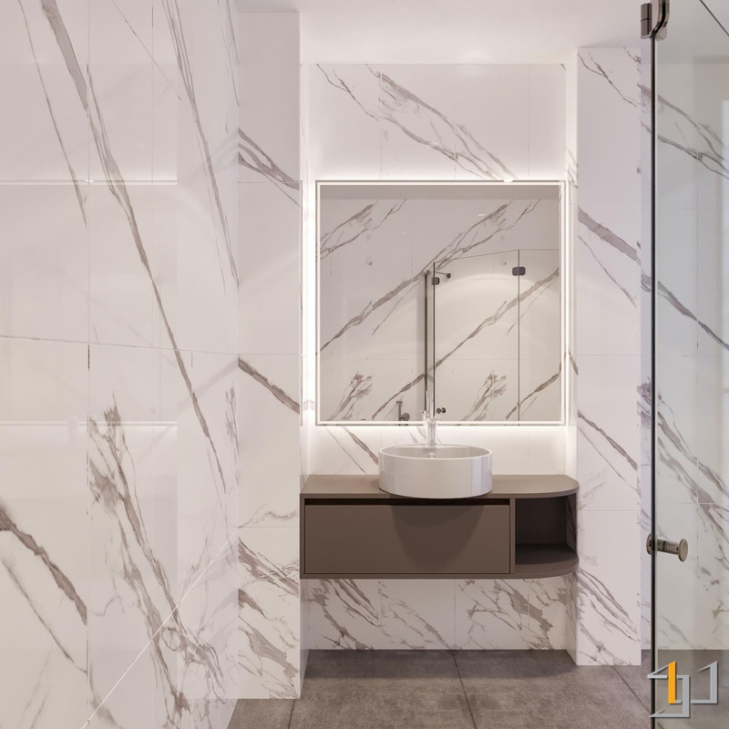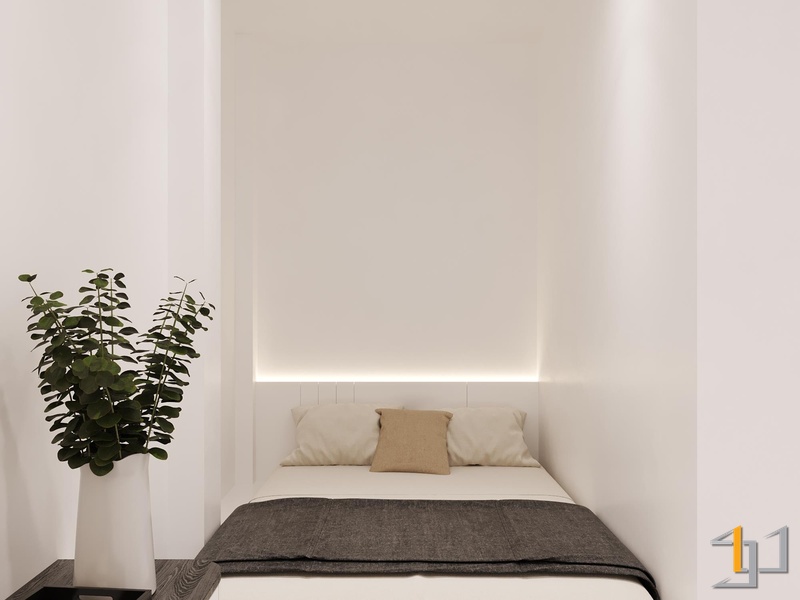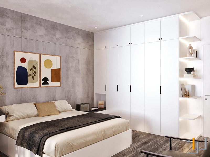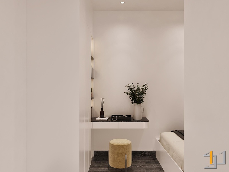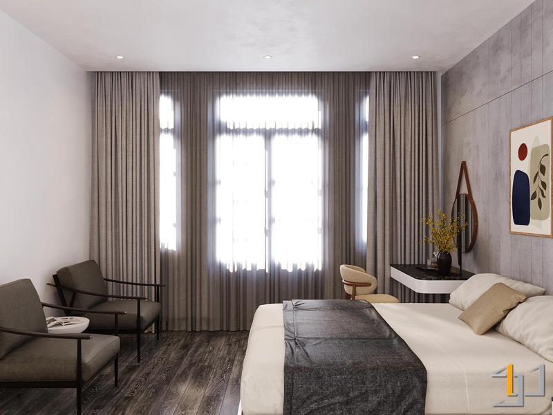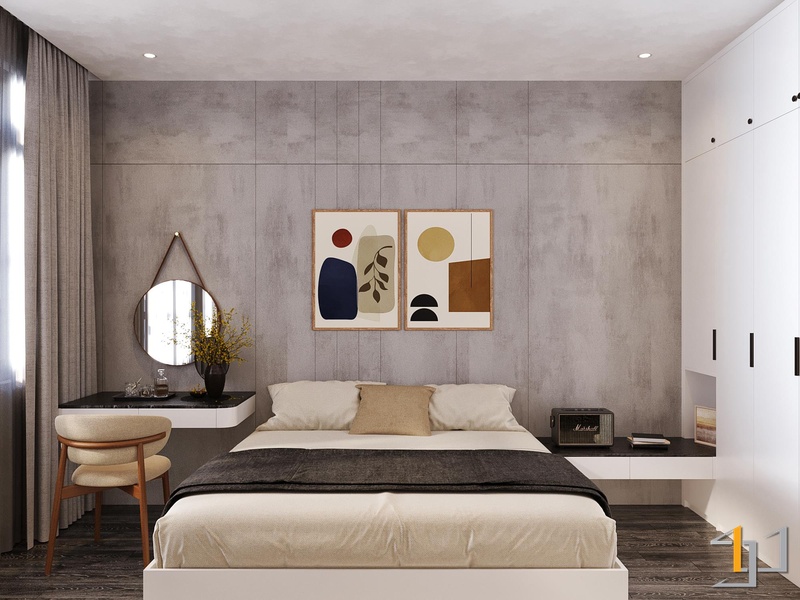 Phòng ngủ tầng hai tiếp tục dùng tông xám lạnh và các bề mặt phẳng để giữ sự tĩnh và sáng. Giường đặt giữa trục tường, tab nổi giúp sàn thoáng và dễ dọn dẹp. Tủ âm tường tối ưu diện tích và giữ phòng gọn. Bàn trang điểm bo cong để hạn chế va chạm khi đi lại. Rèm dày được dùng để kiểm soát ánh sáng, đảm bảo không gian ngủ ổn định và dễ chịu.