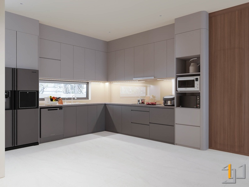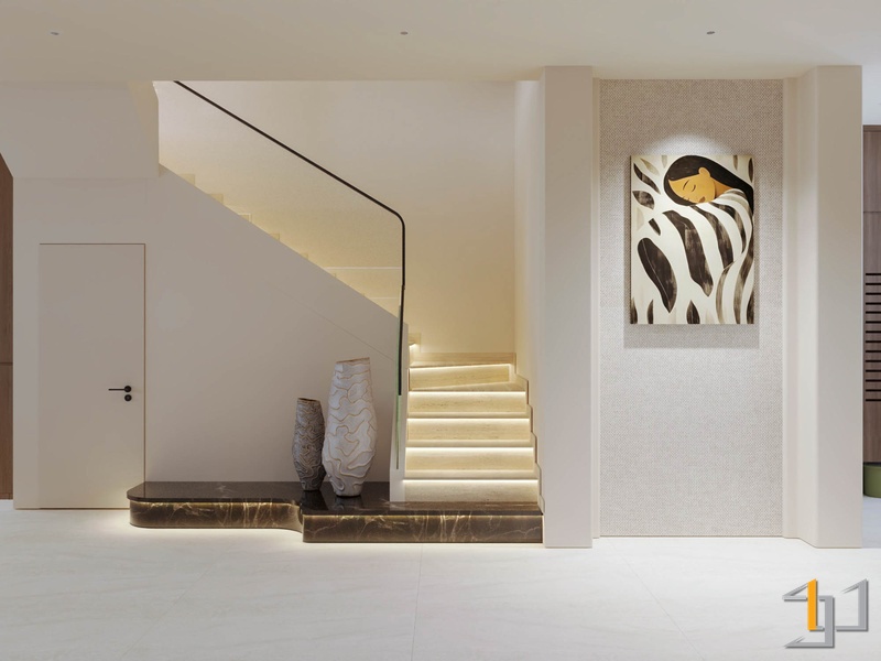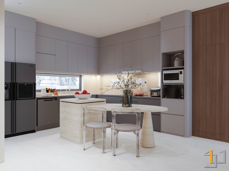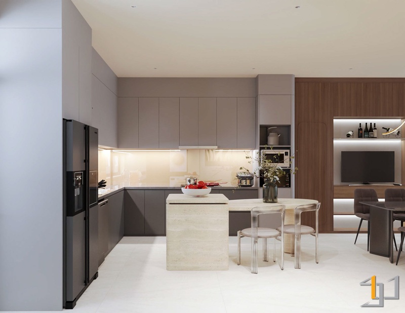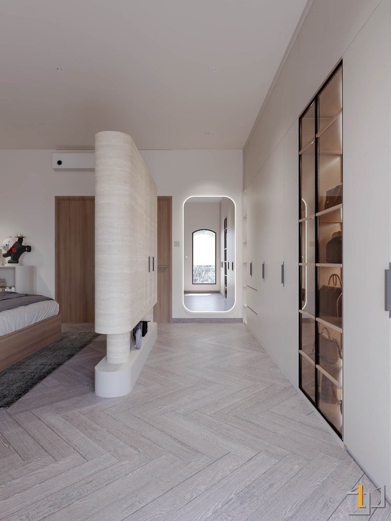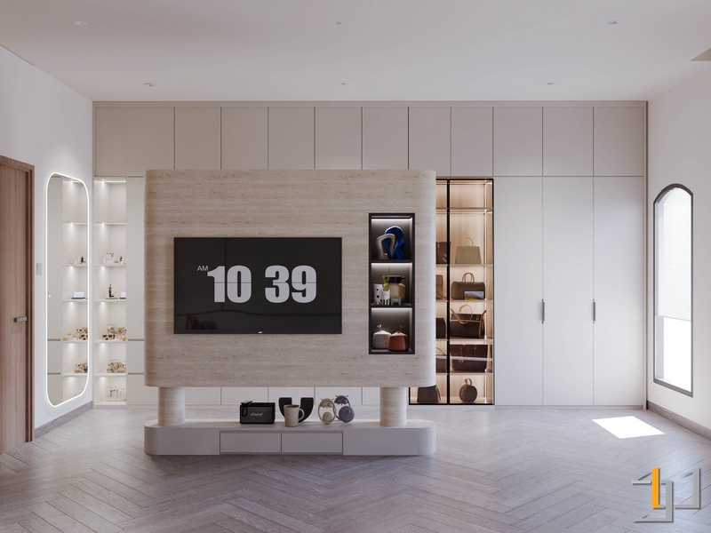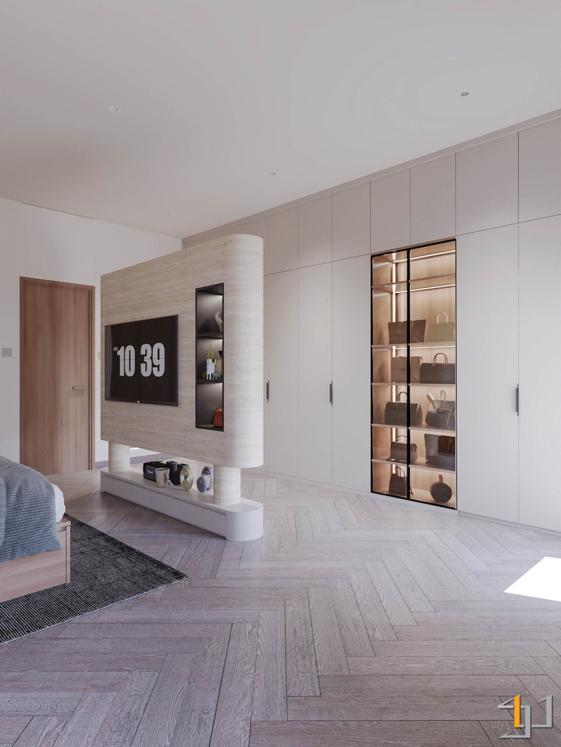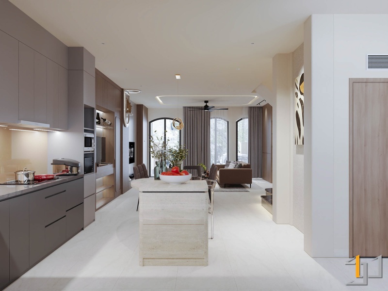 Hệ tủ bếp, tủ áo và các vách trang trí sử dụng gỗ tông sồi và walnut sáng, kết hợp bề mặt sơn matte xám – beige giúp tổng thể nhẹ nhàng và sạch sẽ. Các mảng đá travertine tông kem – vàng cát tại bàn đảo, bàn ăn và vách tivi tạo chiều sâu và cảm giác tự nhiên. Mặt bếp đá trắng đảm bảo độ bền và dễ vệ sinh. Chi tiết gỗ nan, kính sọc và hệ đèn LED uốn theo vách cong giúp không gian mềm mại hơn. Sàn phòng khách lát gạch sáng, phòng ngủ dùng sàn gỗ xương cá để tăng độ ấm.