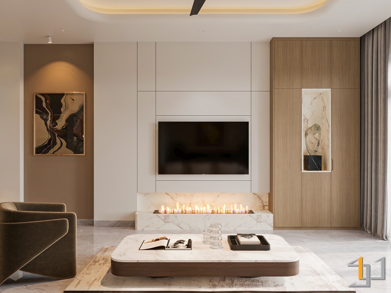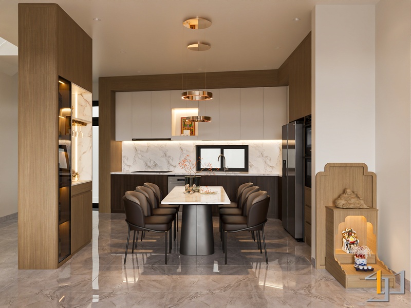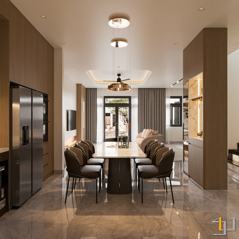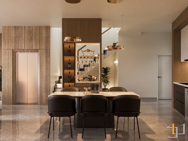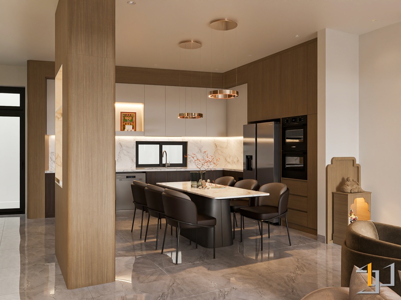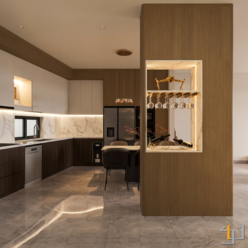 Khu vực phòng khách và bếp sử dụng sàn đá vân marble sáng kết hợp các mảng ốp đá và hệ tủ kịch trần để tạo cảm giác sang trọng nhưng vẫn mạch lạc. Tủ bếp phối hai tông trắng và walnut giúp cân bằng giữa sự sáng và chiều sâu vật liệu. Các chi tiết kim loại mạ vàng ở đèn thả, tay nắm và tủ rượu kính đen tạo điểm nhấn sắc nét, làm nổi bật vẻ tinh gọn của tổng thể không gian.