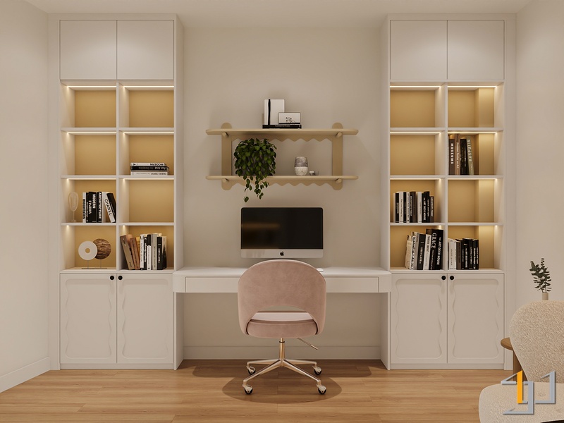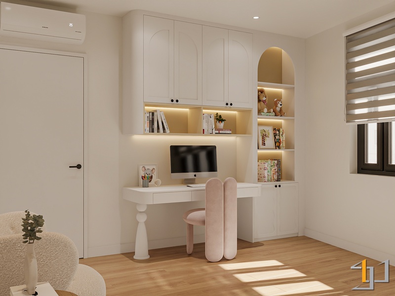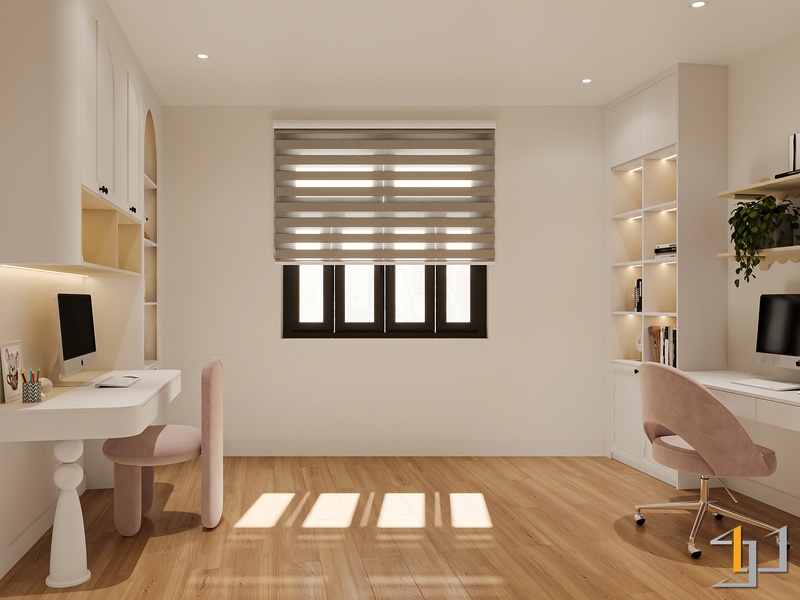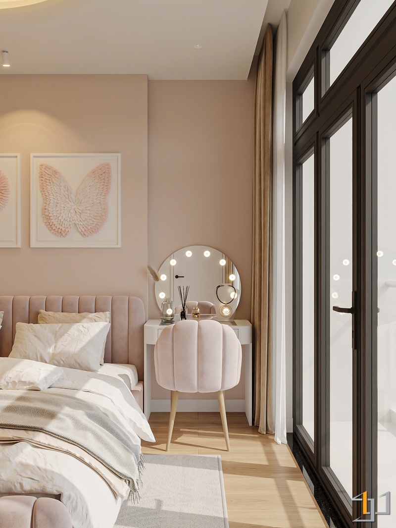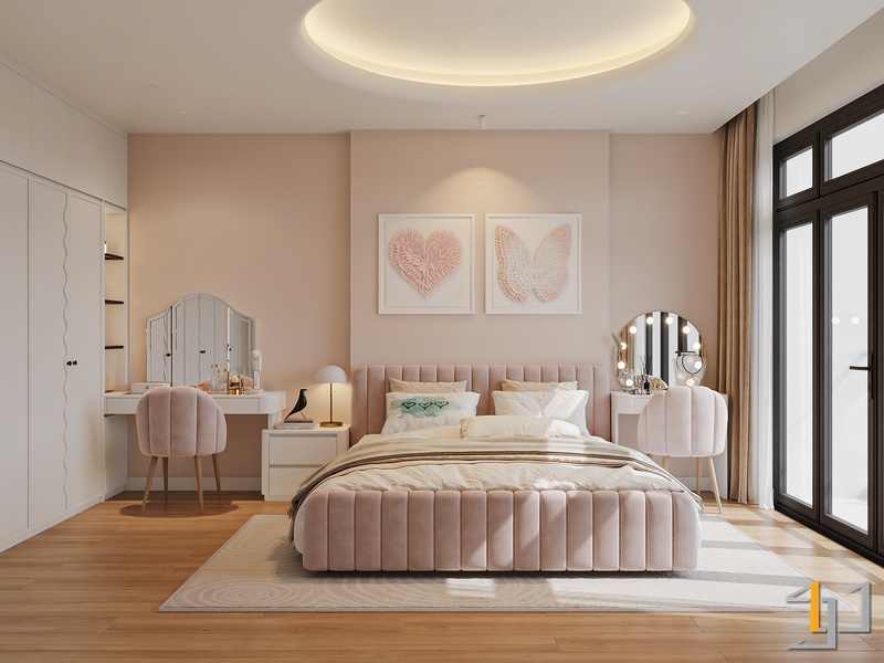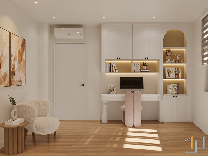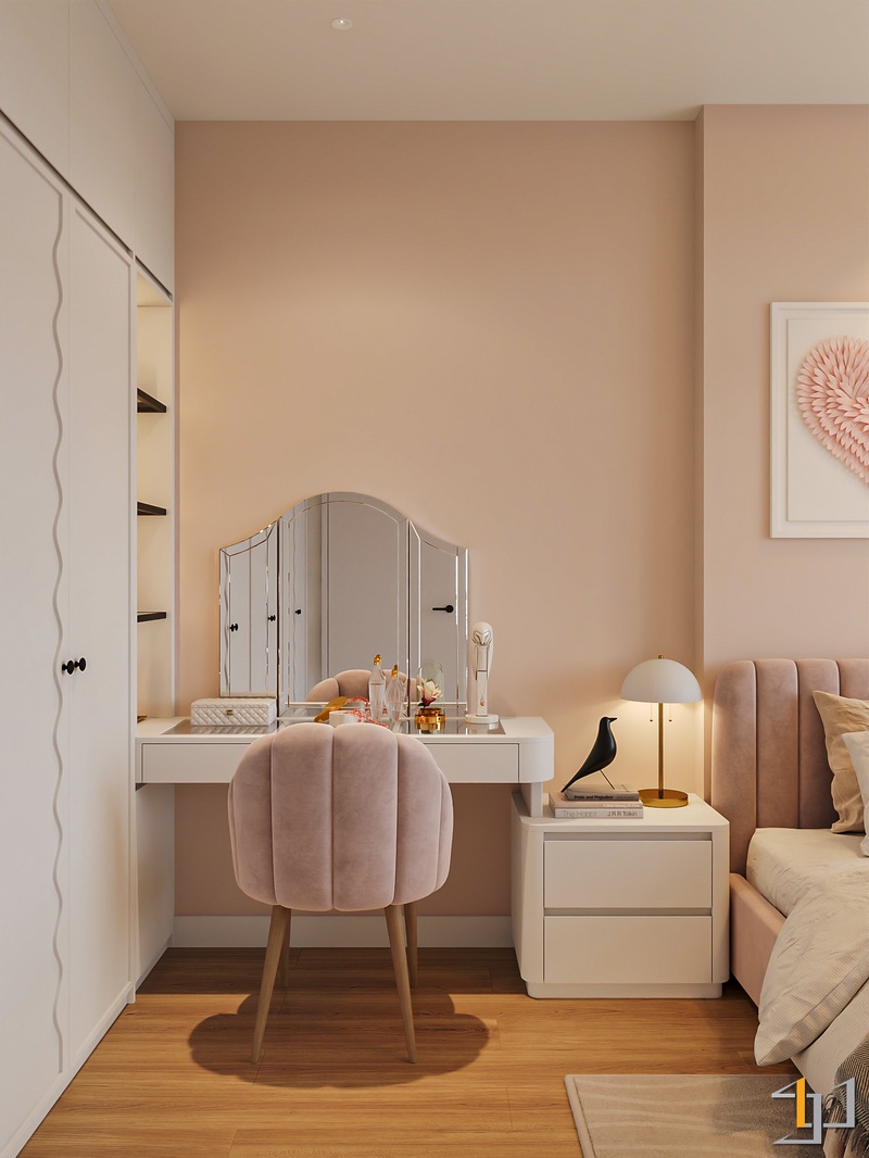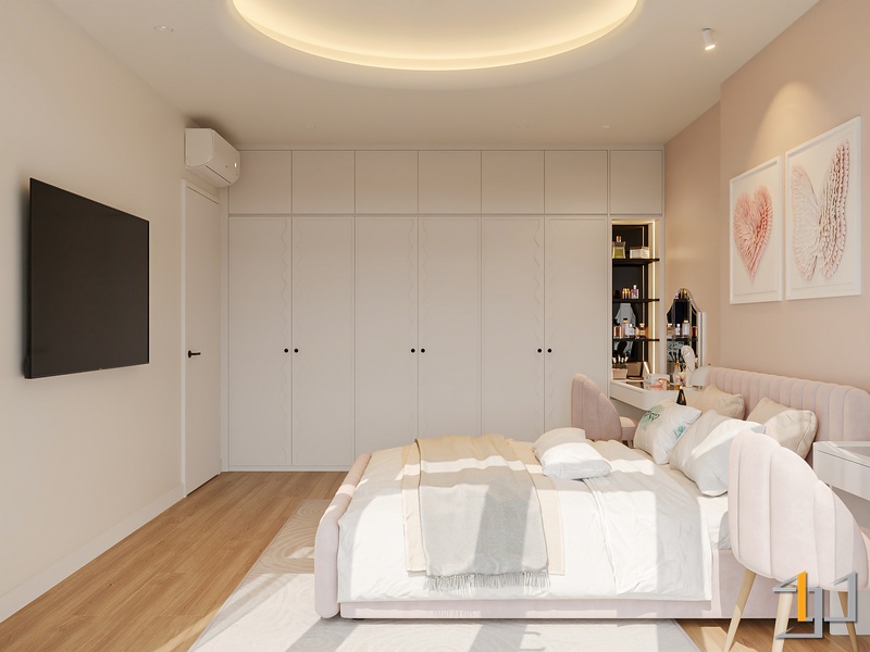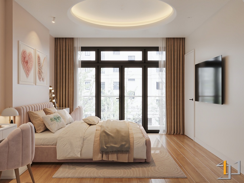 Phòng ngủ được xử lý ấm áp hơn với sàn gỗ và hệ tủ âm tường gọn gàng. Điểm nhấn đặc biệt là bục ngồi cạnh cửa sổ – một góc thư giãn đọc sách, thưởng trà, đồng thời tích hợp ngăn kéo lưu trữ tiện lợi. Bục gỗ walnut nối liền với giường ngủ tạo thành một hệ nội thất liền mạch, giúp căn phòng trông rộng rãi và trật tự hơn.