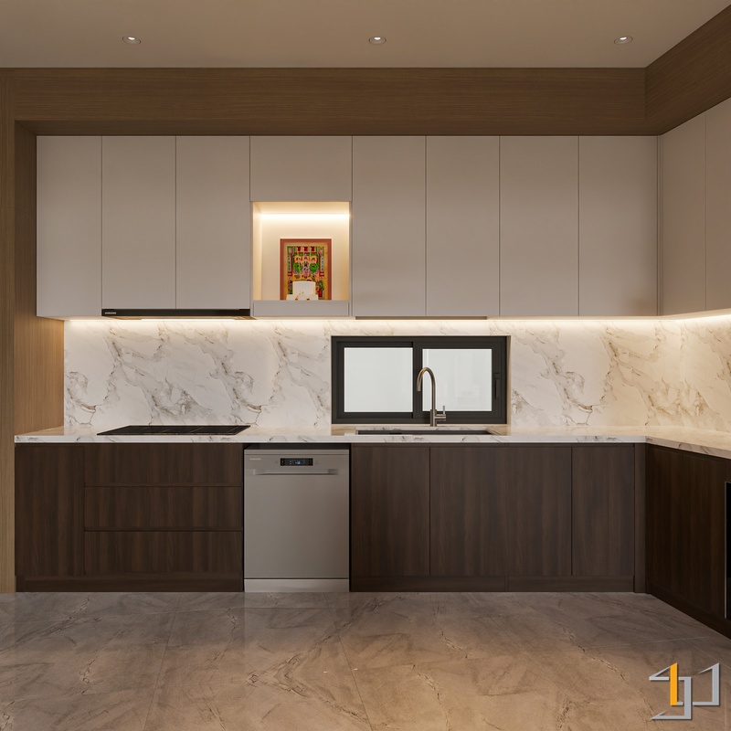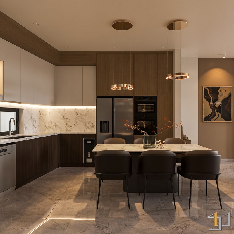 Tổng thể, không gian cân bằng giữa vẻ sang trọng của đá – kim loại và sự ấm áp của gỗ, tạo nên một tổ ấm hiện đại, tinh gọn nhưng vẫn đầy đủ tiện nghi cho nhịp sống hằng ngày.