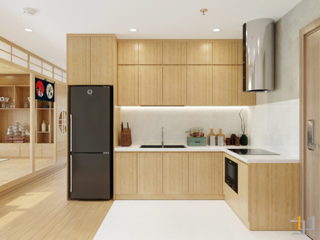 – Tủ chứa tủ lạnh: Gỗ MDF An Cường chống ẩm phủ Melamine