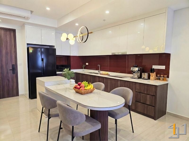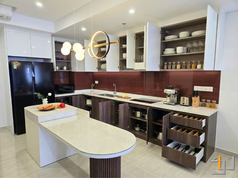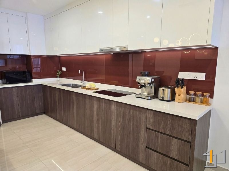 Không gian hoàn thiện gây ấn tượng với hệ vật liệu gỗ An Cường được sử dụng xuyên suốt, tạo sự đồng bộ và cảm giác ấm áp cho toàn bộ căn hộ. Khu bếp là điểm nhấn rõ nét với tủ dưới vân gỗ Walnut trầm ấm kết hợp tủ trên Acrylic trắng bóng gương, giúp không gian vừa có chiều sâu vừa sáng và dễ vệ sinh. Vách kính màu đỏ rượu tạo điểm nhấn mạnh, tăng độ sang cho khu vực nấu nướng.