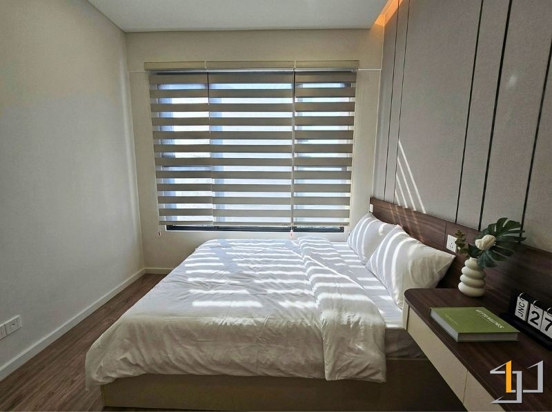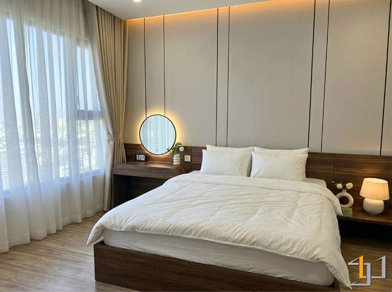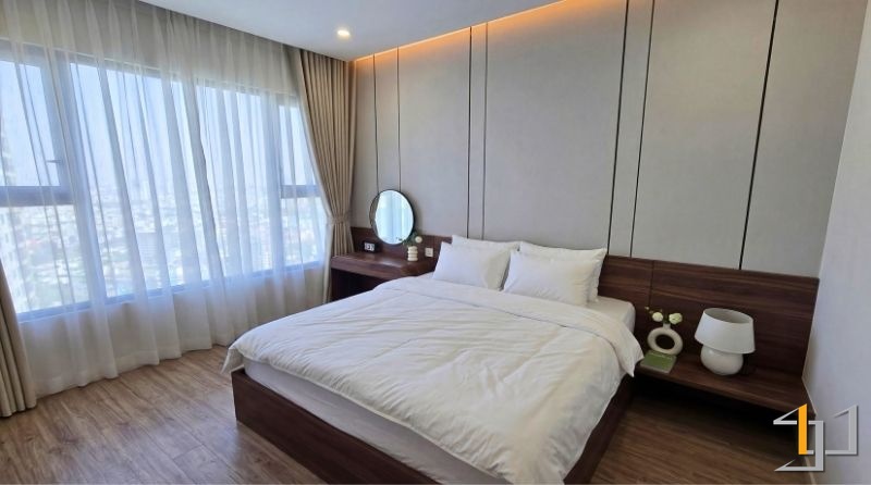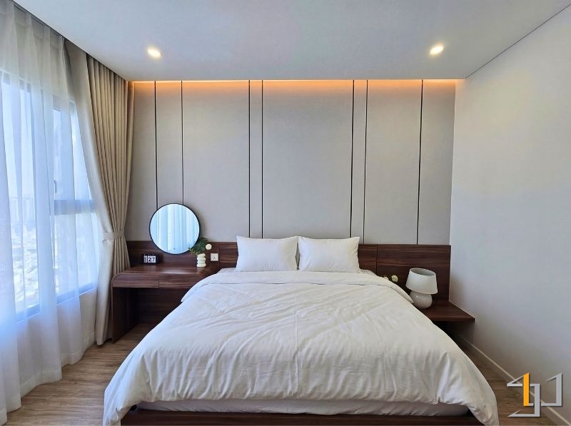 Khu vực nghỉ ngơi sử dụng gỗ nâu ấm cho giường và hệ tủ, kết hợp sàn gỗ sồi sáng tạo cảm giác dễ chịu khi sử dụng. Các chi tiết bo góc, tay nắm âm được xử lý gọn gàng, nâng cao tính thẩm mỹ và độ hoàn thiện.