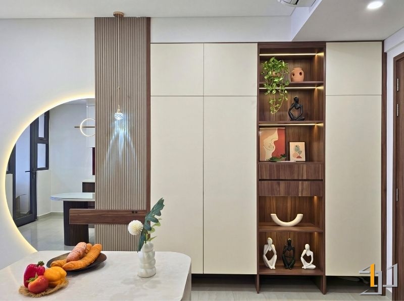 Phòng khách tiếp nối bằng hệ kệ tivi treo tường cùng tông gỗ, các chi tiết bo cong mềm mại kết hợp sofa màu cam đất giúp cân bằng cảm giác ấm – lạnh. Gương tròn LED đặt cạnh bàn ăn hỗ trợ mở rộng không gian và tăng hiệu ứng ánh sáng