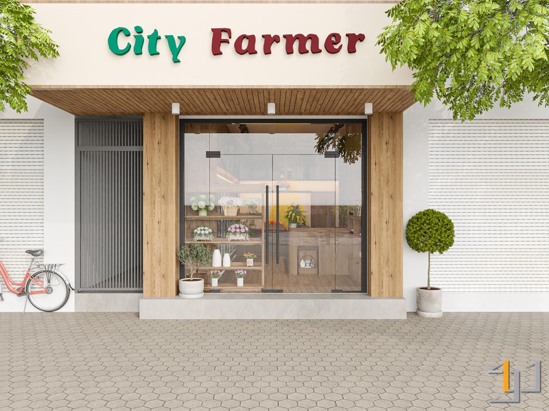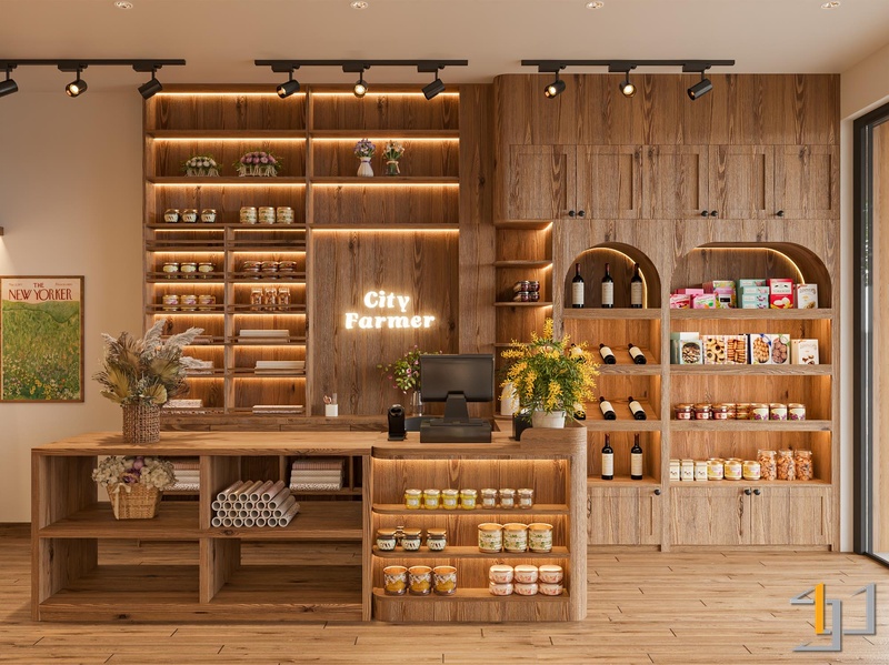 City Farmer được xây dựng như một “nông trại thành thị” thu nhỏ, với chất liệu gỗ công nghiệp tông sồi đậm làm chủ đạo. Gỗ xuất hiện từ sàn, hệ tủ kệ kịch trần đến quầy thanh toán, tạo cảm giác ấm cúng và gần gũi.