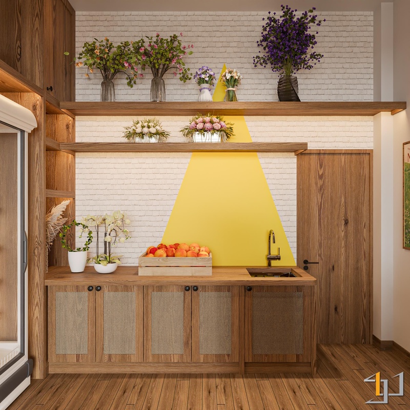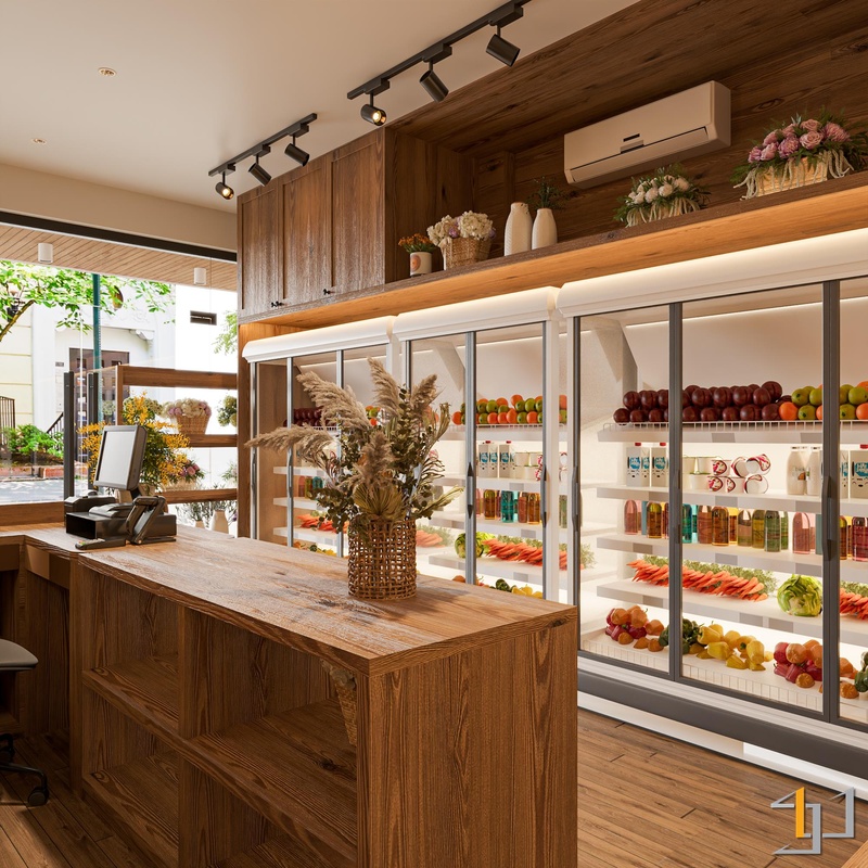Hệ kệ kết hợp kệ hở và ngăn kéo dưới, tối ưu trưng bày lẫn lưu trữ. Quầy cashier dùng các tấm gỗ dày, bo góc tròn để tăng thẩm mỹ và an toàn. Sàn gỗ cùng tông giúp không gian liền mạch, có chiều sâu.