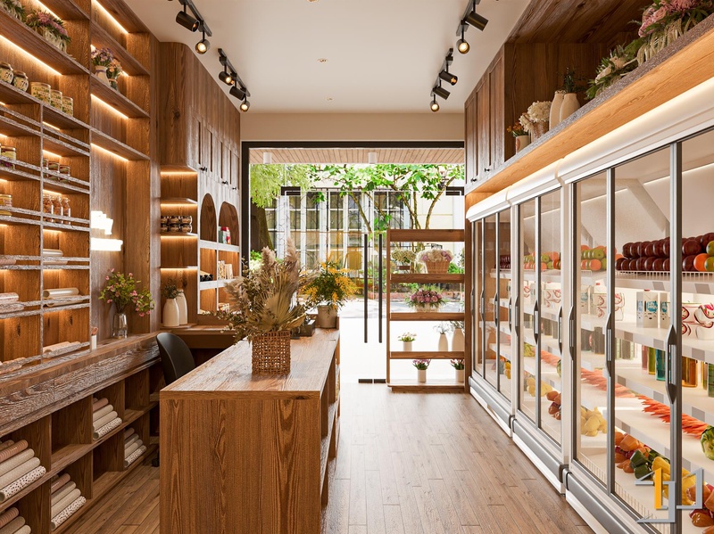 Đèn ray đen và LED âm kệ chiếu sáng trực tiếp vào sản phẩm. Giỏ mây và hoa khô trang trí hoàn thiện một không gian gỗ ấm áp, sáng sủa và tạo được niềm tin về sự tươi sạch.