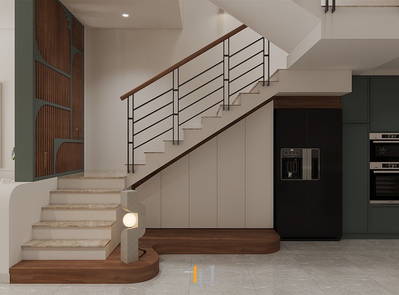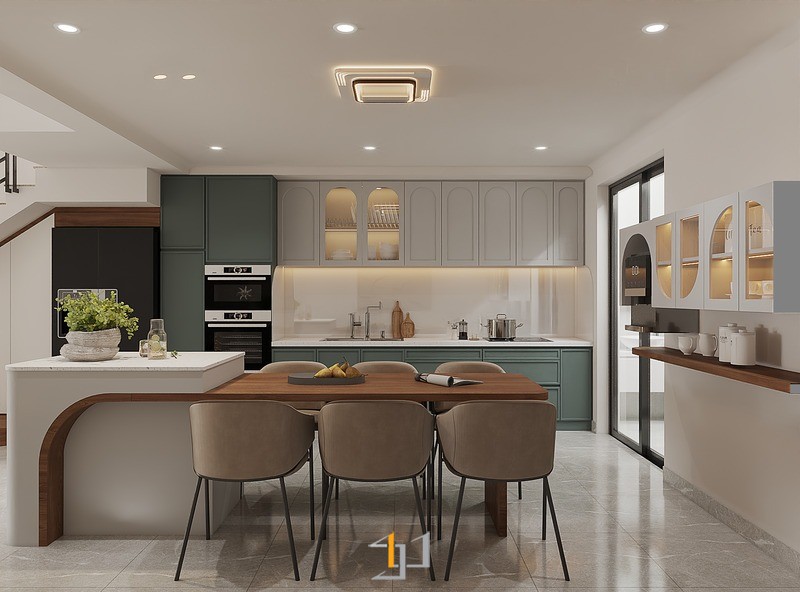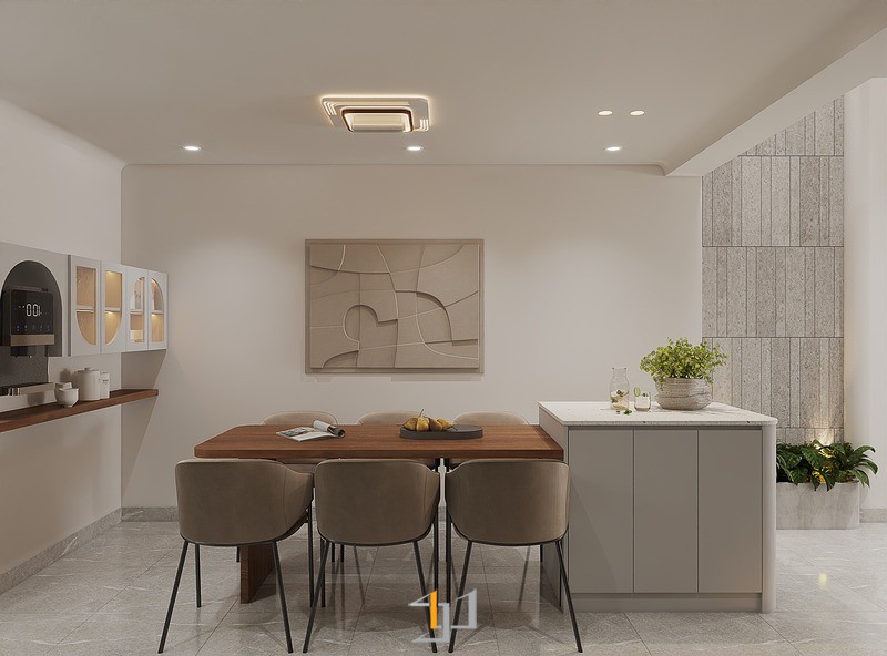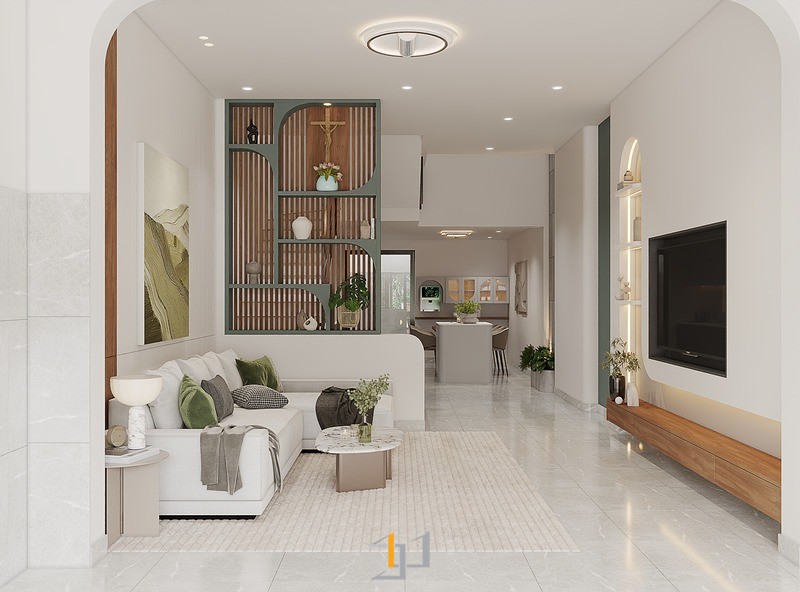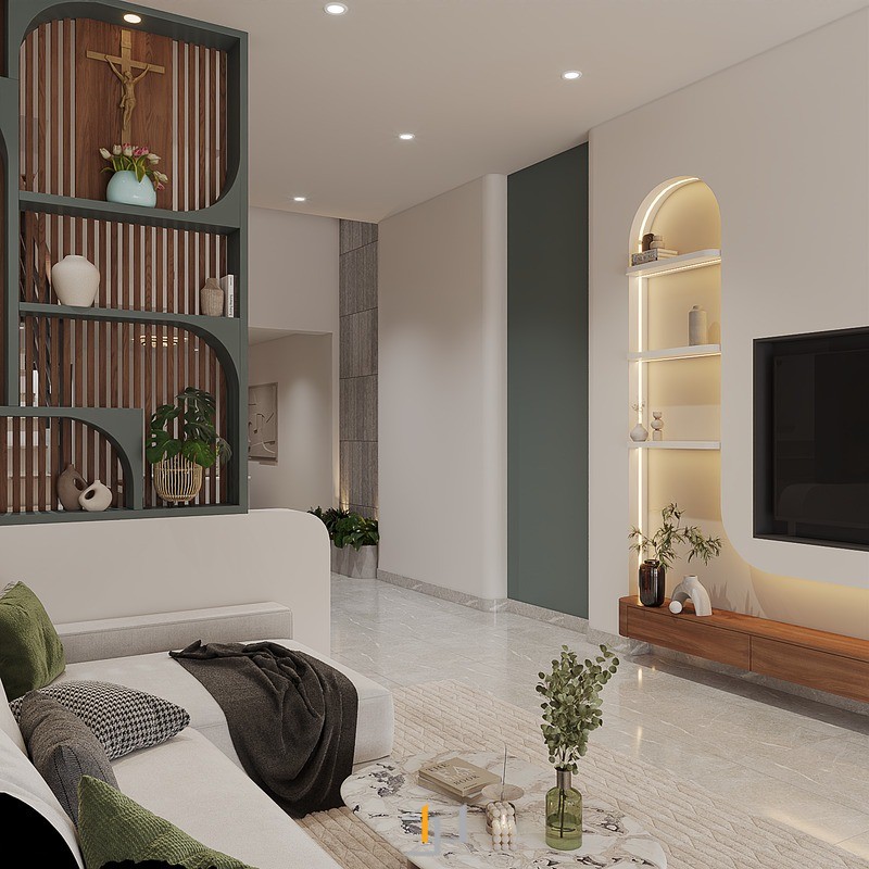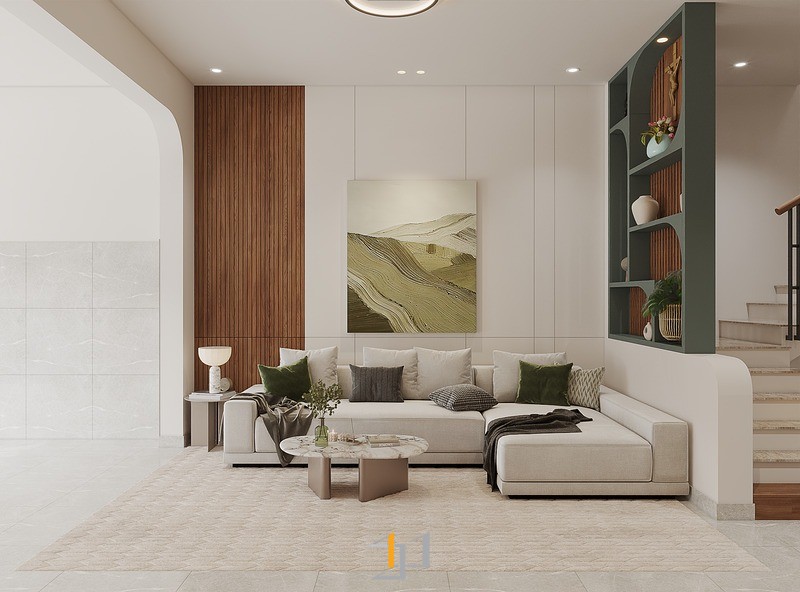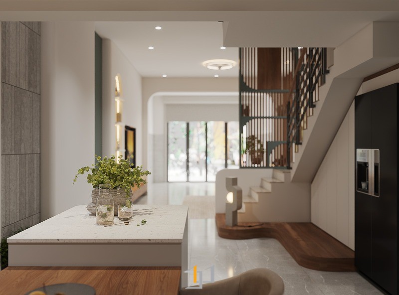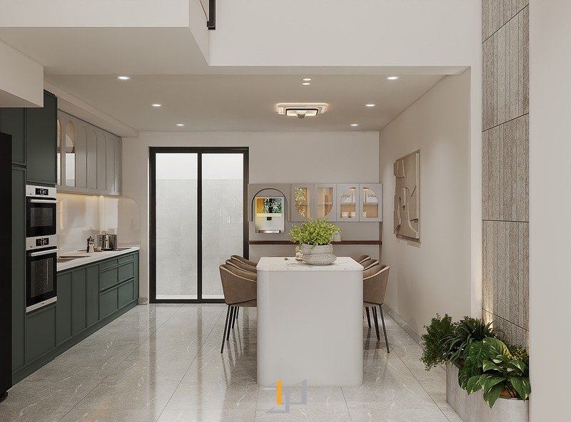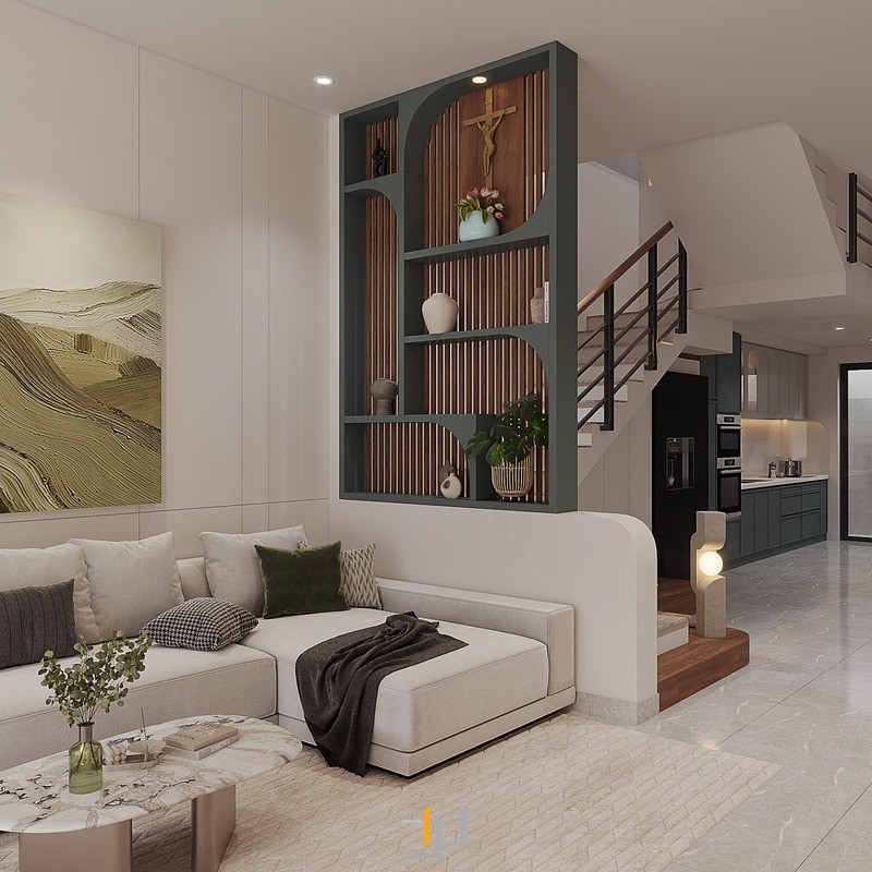 Ngôi nhà phố 3 tầng tại quận 12 thể hiện rõ phong cách Hiện đại, tập trung vào sự tối giản, tiện nghi và sử dụng các đường nét mềm mại. Không gian sinh hoạt chung (phòng khách, bếp, ăn) được thiết kế theo bố cục mở, tận dụng tối đa ánh sáng tự nhiên và sự liên thông để tạo cảm giác rộng rãi, thoáng đãng. Bảng màu chủ đạo là tông trung tính (trắng, be, xám nhạt) được nhấn nhá bằng màu xanh rêu đậm, tạo sự thư thái và có chiều sâu.