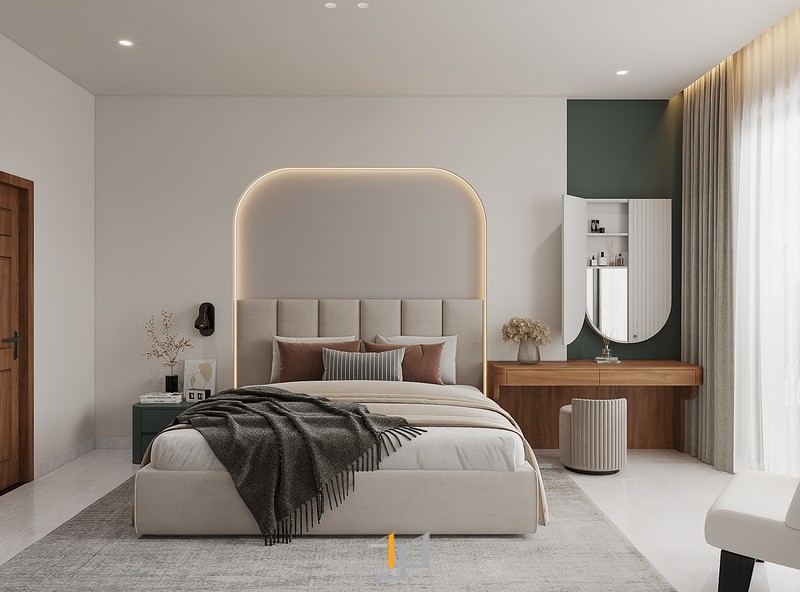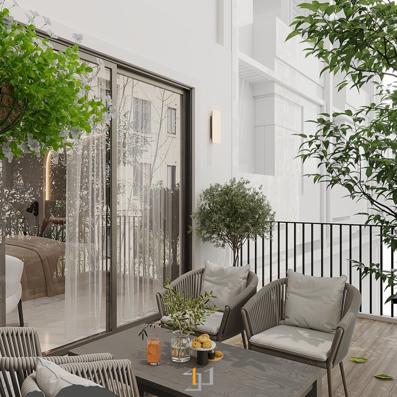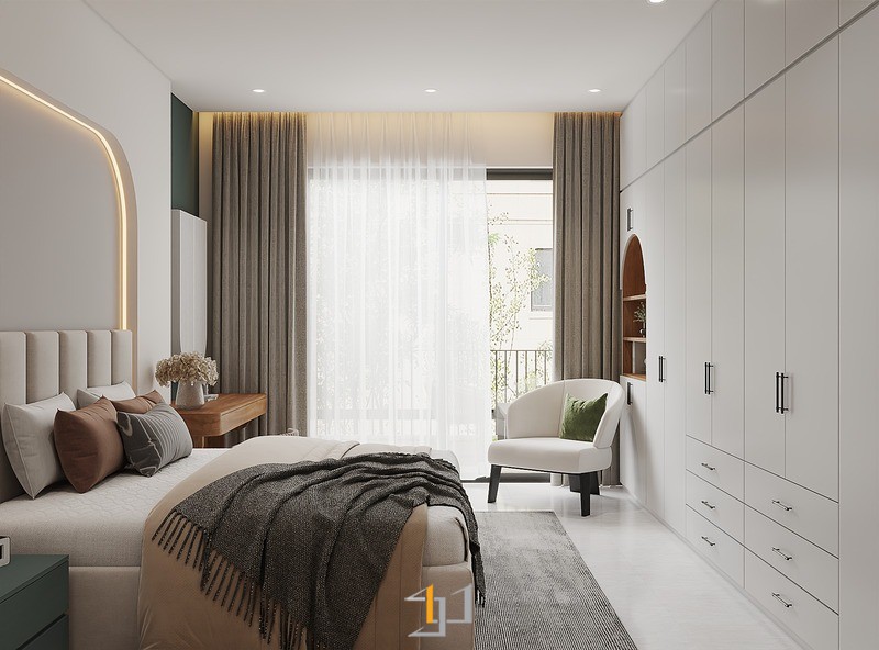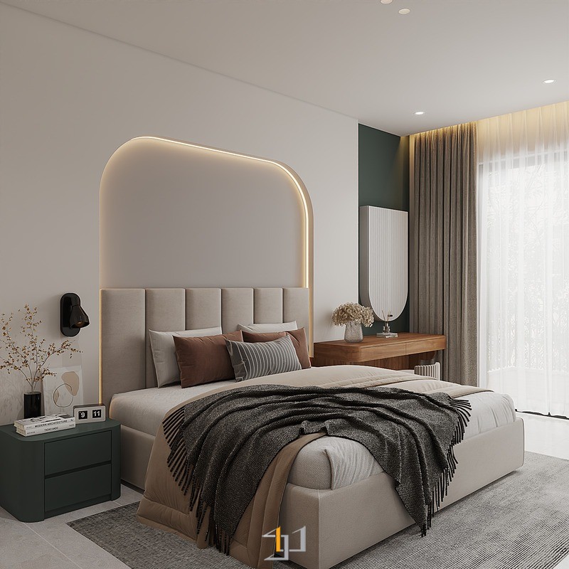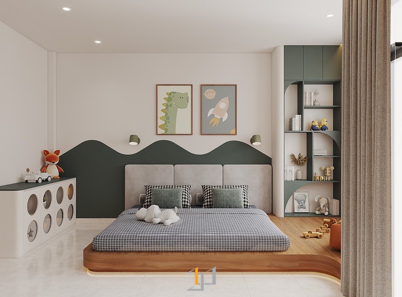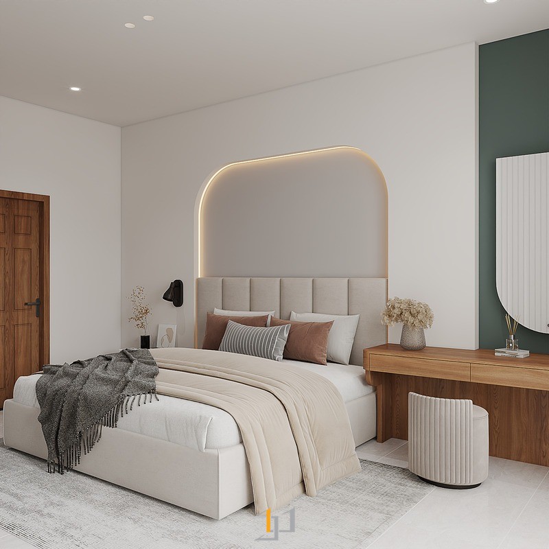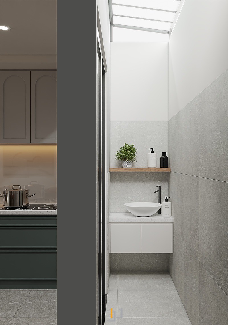Ngôi nhà phố 3 tầng tại quận 12 thể hiện rõ phong cách Hiện đại, tập trung vào sự tối giản, tiện nghi và sử dụng các đường nét mềm mại. Không gian sinh hoạt chung (phòng khách, bếp, ăn) được thiết kế theo bố cục mở, tận dụng tối đa ánh sáng tự nhiên và sự liên thông để tạo cảm giác rộng rãi, thoáng đãng. Bảng màu chủ đạo là tông trung tính (trắng, be, xám nhạt) được nhấn nhá bằng màu xanh rêu đậm, tạo sự thư thái và có chiều sâu.