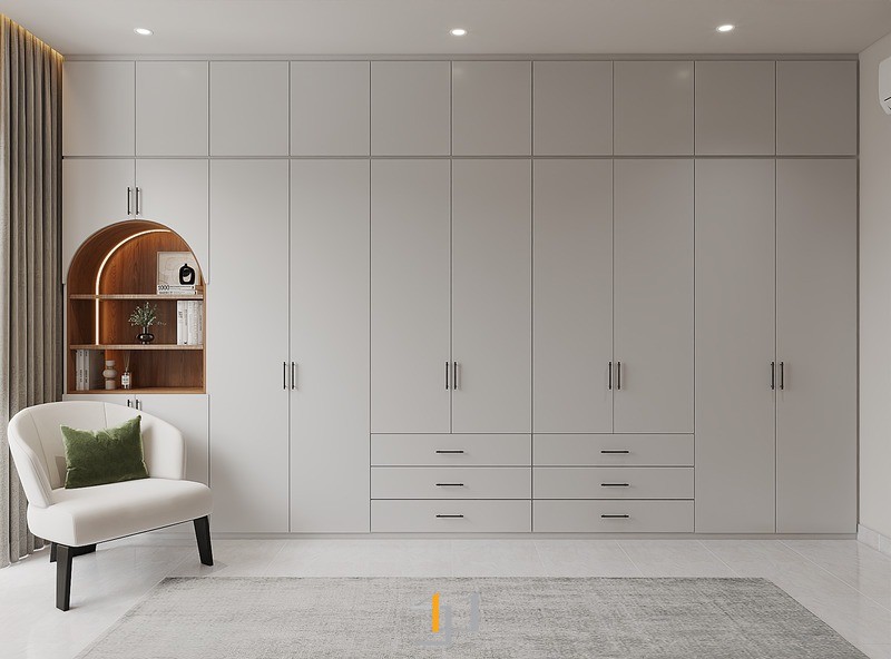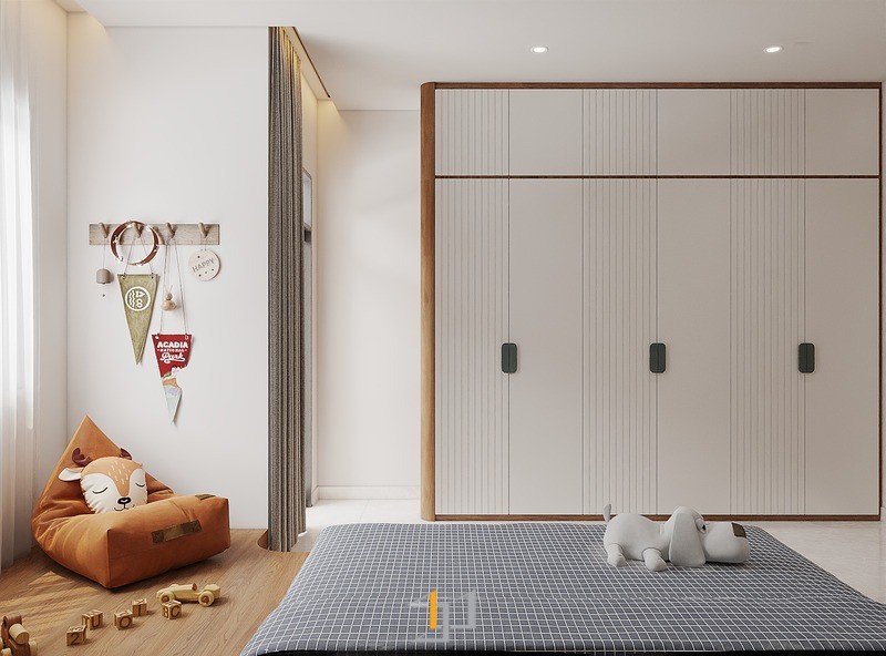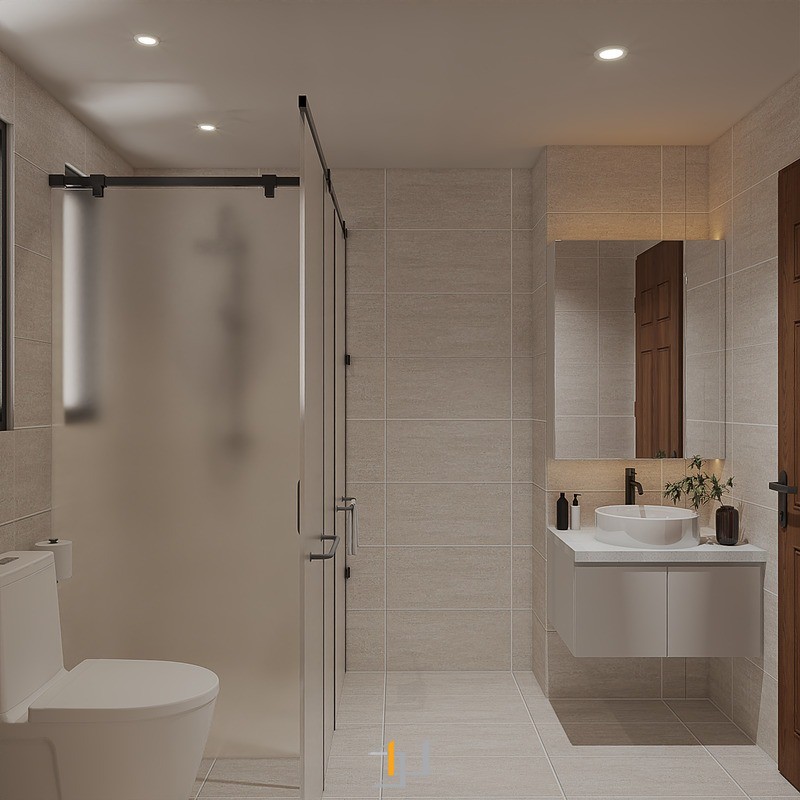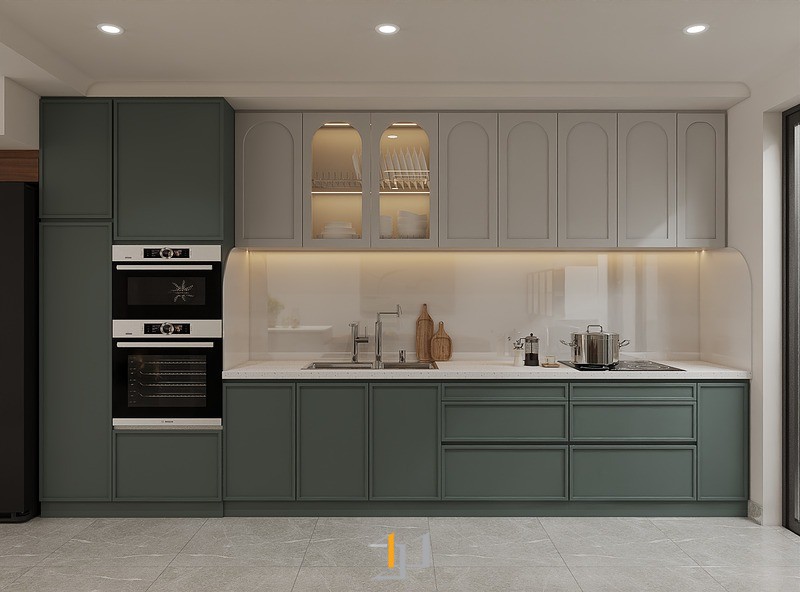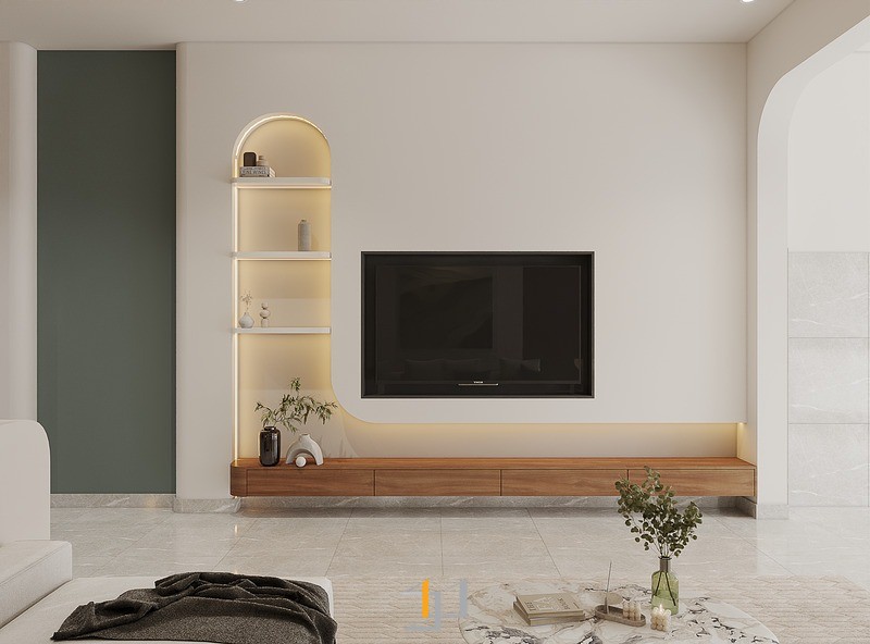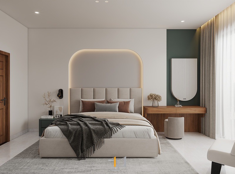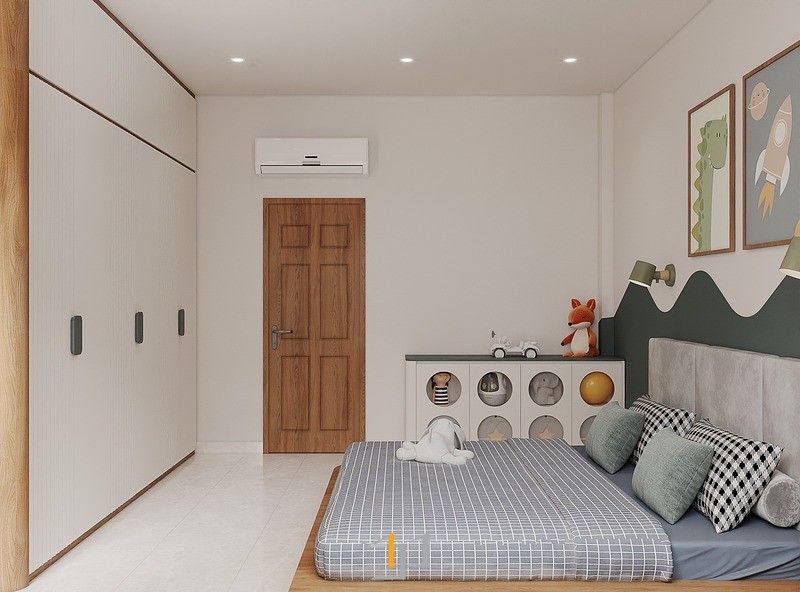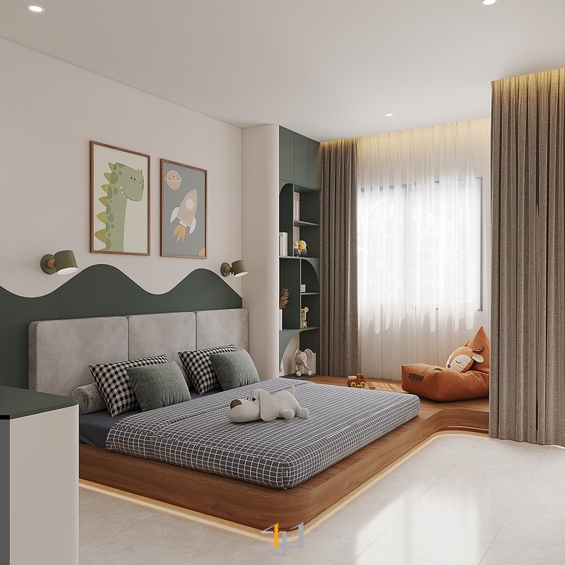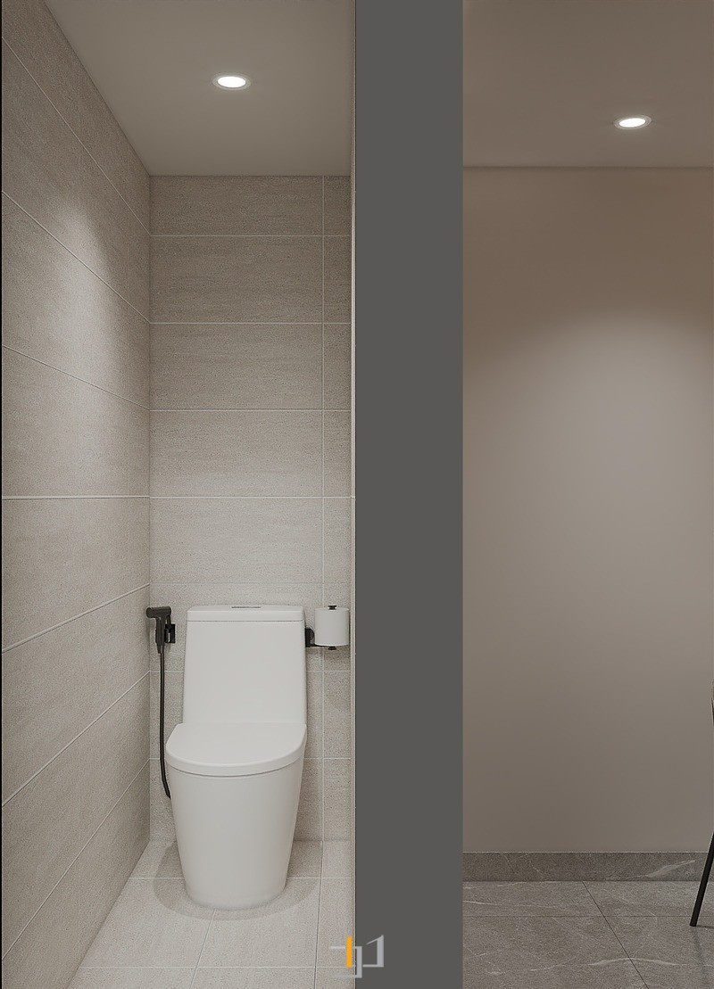 Ngôi nhà phố 3 tầng tại quận 12 thể hiện rõ phong cách Hiện đại, tập trung vào sự tối giản, tiện nghi và sử dụng các đường nét mềm mại. Không gian sinh hoạt chung (phòng khách, bếp, ăn) được thiết kế theo bố cục mở, tận dụng tối đa ánh sáng tự nhiên và sự liên thông để tạo cảm giác rộng rãi, thoáng đãng. Bảng màu chủ đạo là tông trung tính (trắng, be, xám nhạt) được nhấn nhá bằng màu xanh rêu đậm, tạo sự thư thái và có chiều sâu.