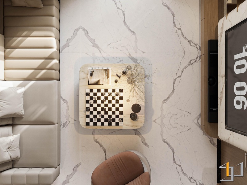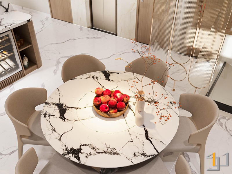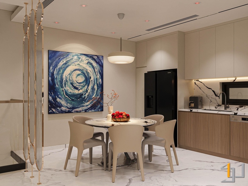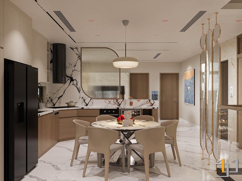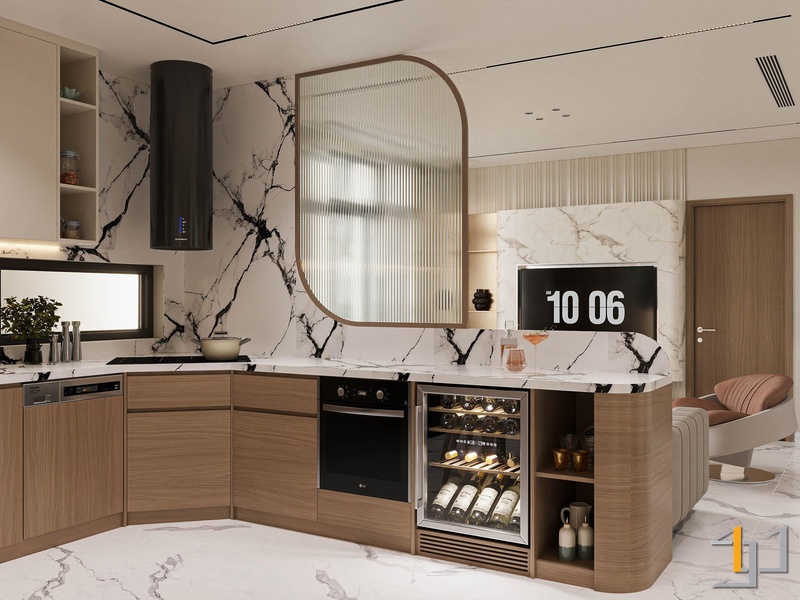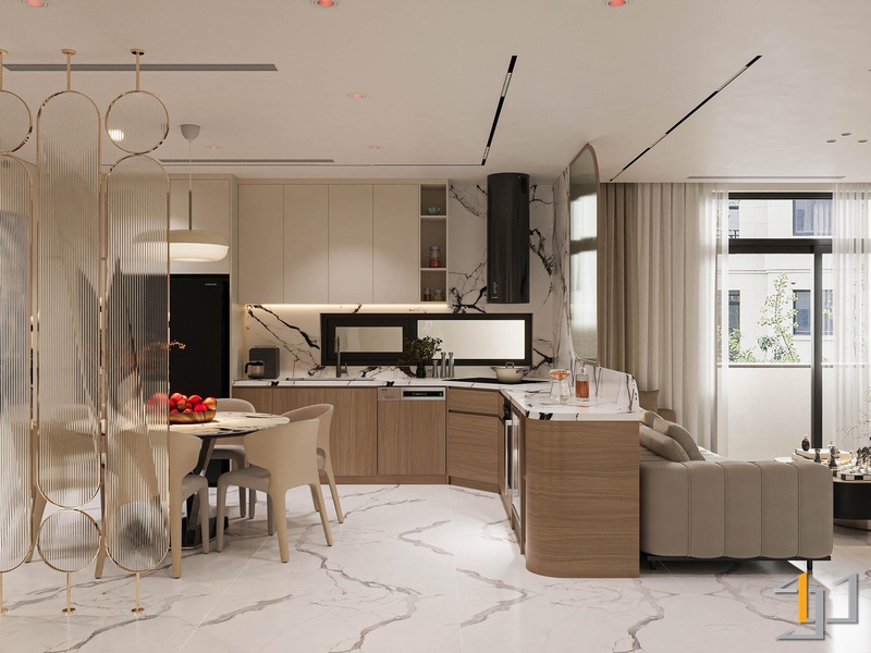 Khu vực bếp, bàn ăn và phòng khách được bố trí liên thông, tạo thành một không gian mở liền mạch. Bếp được thiết kế chữ L tận dụng tối đa góc nhà, với tông màu trắng, vân đá marble kết hợp gỗ sáng màu cho tủ dưới. Sự tương phản này mang lại vẻ hiện đại và ấm cúng.