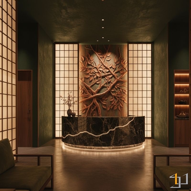 Sảnh lễ tân là “bộ mặt” và là “cửa ngõ năng lượng” của toàn bộ spa. Mục tiêu của chúng tôi là kiến tạo một không gian vừa gây ấn tượng thương hiệu mạnh mẽ, vừa tối ưu quy trình đón tiếp và kích hoạt dòng năng lượng tài lộc.