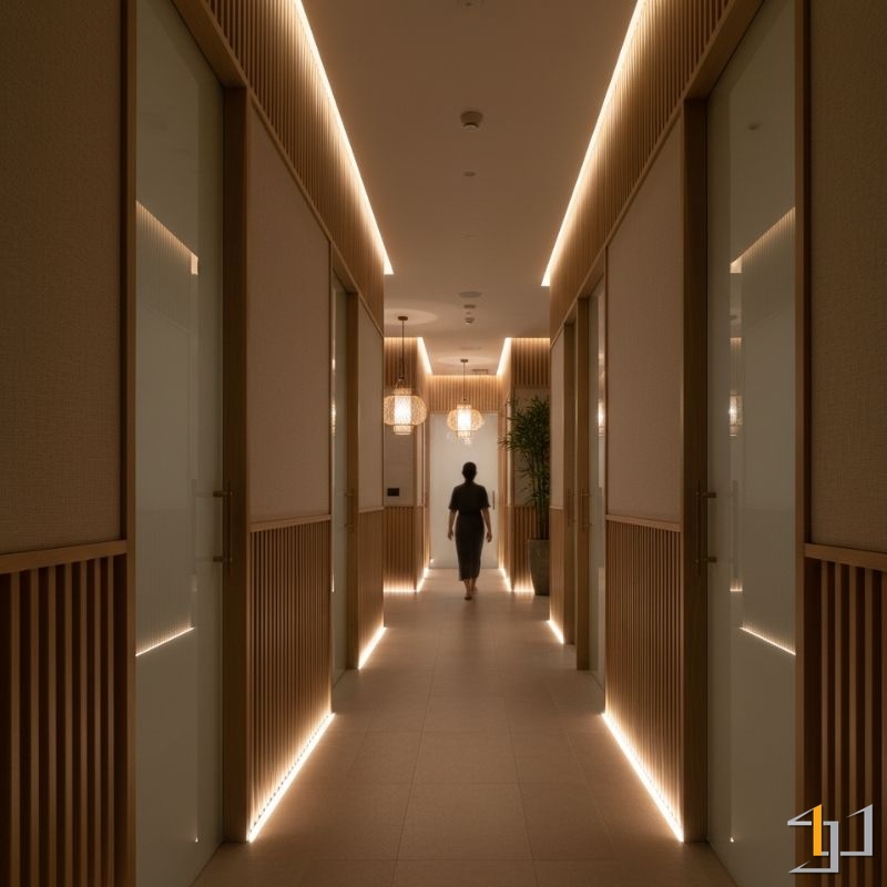 Tối Ưu Công Năng Cho Dịch Vụ Chuyên Nghiệp: Layout được thiết kế để tách biệt khu vực massage yên tĩnh và khu vực beauty sôi động. Ánh sáng tại các bàn làm nail, trang điểm được tính toán với độ hoàn màu cao (CRI>90), đảm bảo kết quả làm đẹp được thể hiện một cách chân thực nhất.
