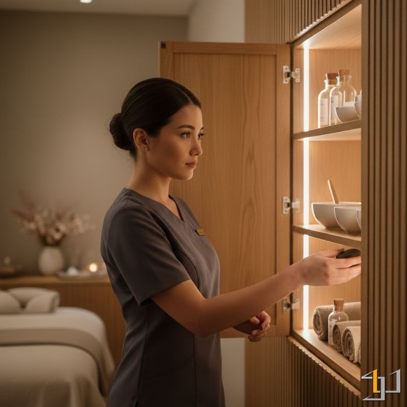- Công năng “Vô hình”: Các tủ kệ âm tường được thiết kế để lưu trữ dụng cụ, khăn và tinh dầu một cách gọn gàng, nằm ngay trong tầm với của kỹ thuật viên. Điều này đảm bảo quy trình trị liệu diễn ra liền mạch, không bị gián đoạn, duy trì một không gian thanh tịnh và chuyên nghiệp trong suốt quá trình phục vụ.