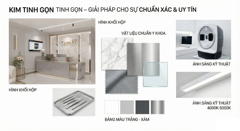 - Hình khối & Bố cục: Ưu tiên đường nét thẳng và hình khối hộp nhằm tạo cảm giác sắc sảo, hiện đại. Lựa chọn này đồng thời tối ưu hóa công năng vận hành, giúp bố trí thiết bị y tế một cách khoa học và thuận tiện nhất.