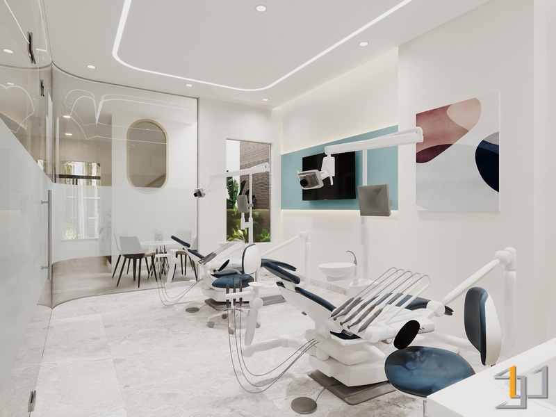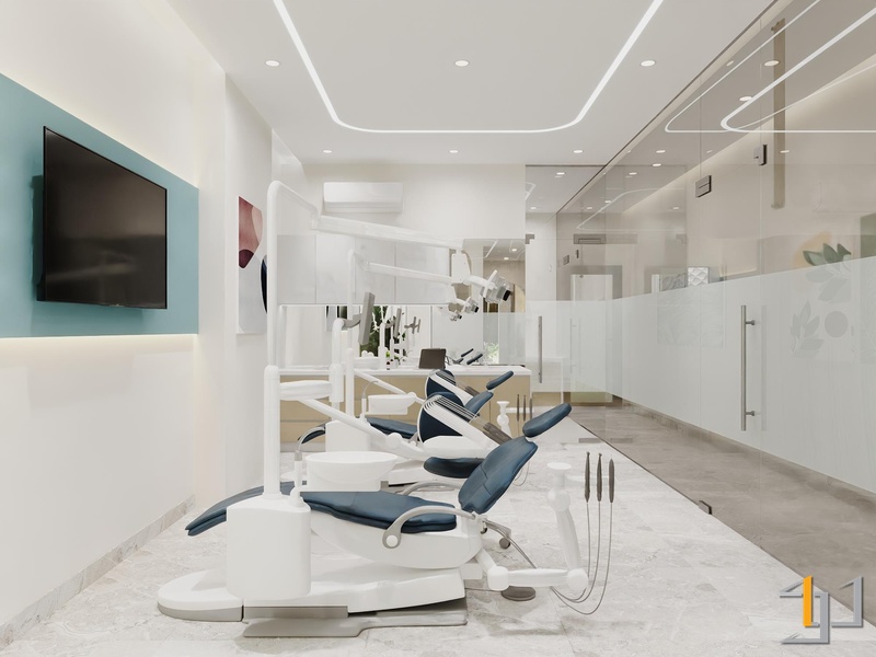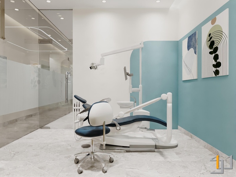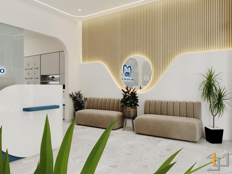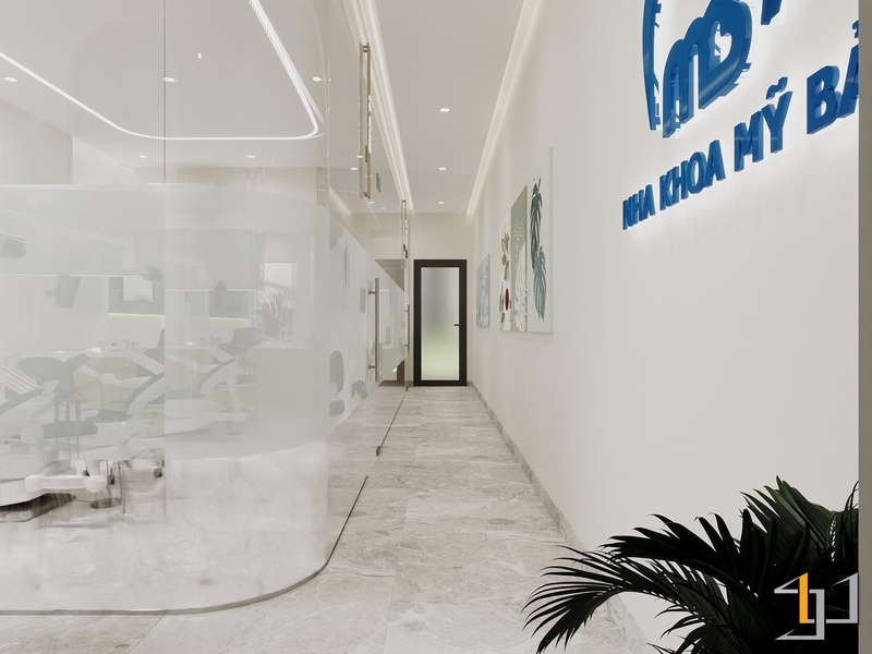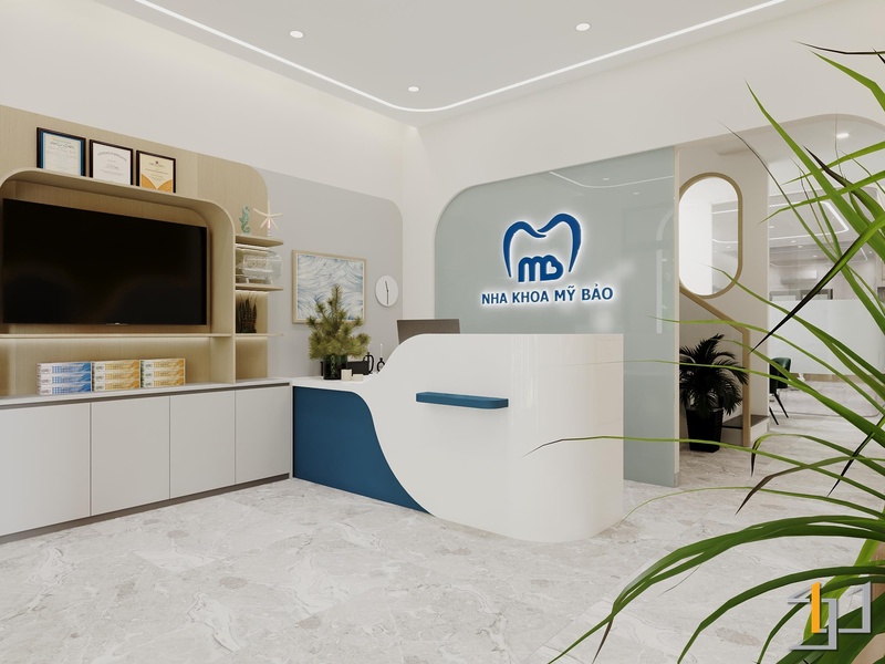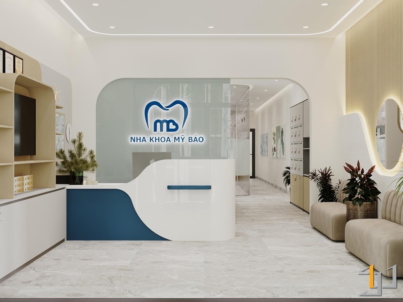 Phòng khám Nha khoa Mỹ Bảo được thiết kế theo phong cách hiện đại, tối giản với tông màu trắng chủ đạo kết hợp cùng sắc xanh thương hiệu và gỗ ấm tạo cảm giác sạch sẽ, tin cậy. Các đường nét kiến trúc ưu tiên sự mềm mại thông qua các chi tiết bo cong tại vòm cửa, trần nhà, gương và quầy lễ tân, giúp xóa bỏ cảm giác khô cứng thường thấy ở cơ sở y tế. Không gian điều trị và sảnh chờ được phân chia khoa học, sử dụng vách kính trong suốt để tối ưu hóa ánh sáng và tạo độ thông thoáng cho toàn bộ diện tích. Nội thất được bố trí gọn gàng, tiện nghi với hệ thống ghế nha khoa cao cấp và tủ kệ âm tường giúp tối đa hóa không gian di chuyển cho bác sĩ.