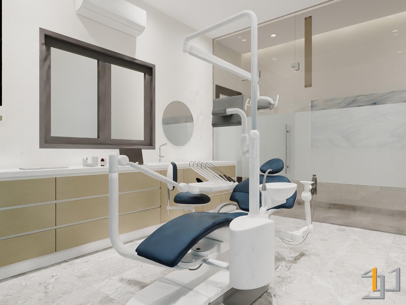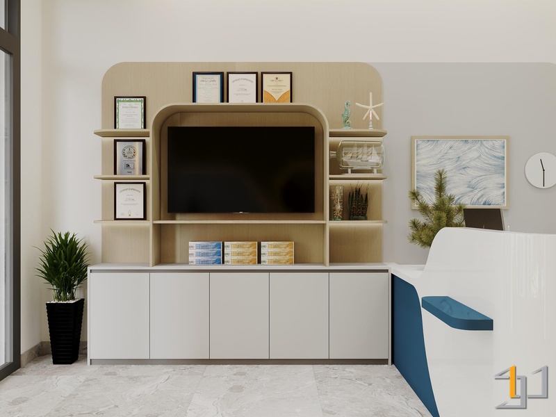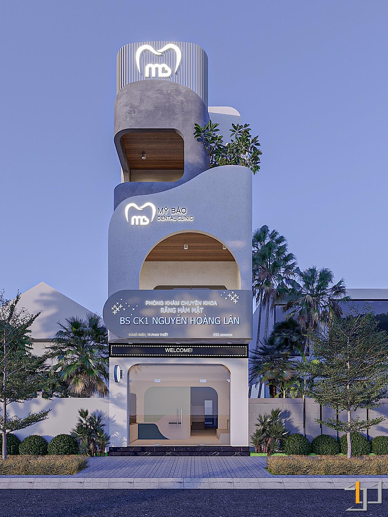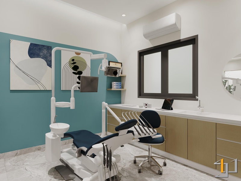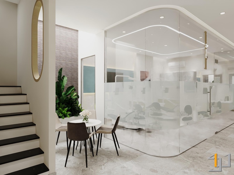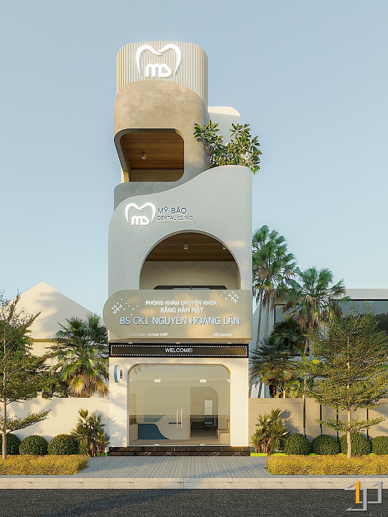 Phòng khám Nha khoa Mỹ Bảo được thiết kế theo phong cách hiện đại, tối giản với tông màu trắng chủ đạo kết hợp cùng sắc xanh thương hiệu và gỗ ấm tạo cảm giác sạch sẽ, tin cậy. Các đường nét kiến trúc ưu tiên sự mềm mại thông qua các chi tiết bo cong tại vòm cửa, trần nhà, gương và quầy lễ tân, giúp xóa bỏ cảm giác khô cứng thường thấy ở cơ sở y tế. Không gian điều trị và sảnh chờ được phân chia khoa học, sử dụng vách kính trong suốt để tối ưu hóa ánh sáng và tạo độ thông thoáng cho toàn bộ diện tích. Nội thất được bố trí gọn gàng, tiện nghi với hệ thống ghế nha khoa cao cấp và tủ kệ âm tường giúp tối đa hóa không gian di chuyển cho bác sĩ.