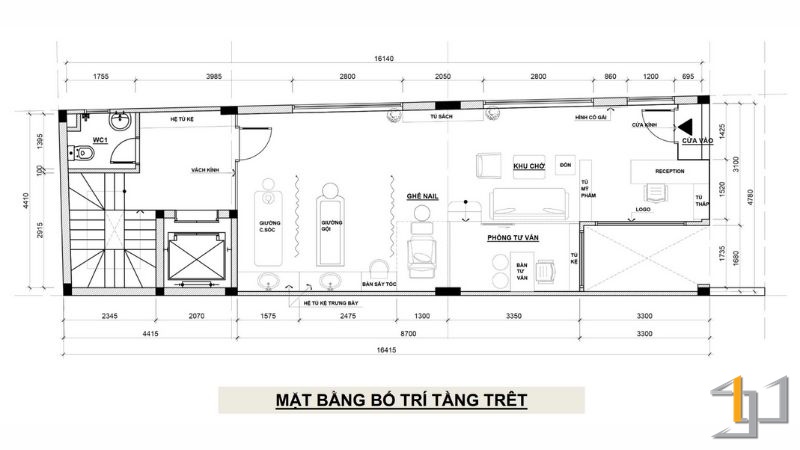Mẫu thiết kế spa ứng dụng phong cách tân cổ điển sang trọng, kết hợp cùng bảng màu sáng thiên ấm tạo ra không gian trải nghiệm dịch vụ khó quên trong lòng khách hàng. Từng khu vực chức năng có sự phân biệt rõ ràng và sắp xếp hợp lý. Điển hình như việc bày trí một tủ trưng bày sản phẩm tại khu vực tư vấn để nhân viên dễ dàng đưa ra những mẫu thử cho khách hàng của họ. Thiết kế bố trí nhiều cửa sổ lớn bằng kính để tận dụng lợi thế về cảnh quan và ánh sáng của nhà phố 2 mặt tiền. Bên trong không gian sử dụng nhiều chi tiết kim loại ánh kim tạo ra hiệu ứng lung linh và đẳng cấp cho spa.