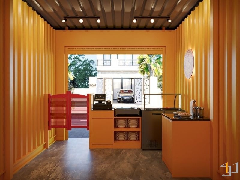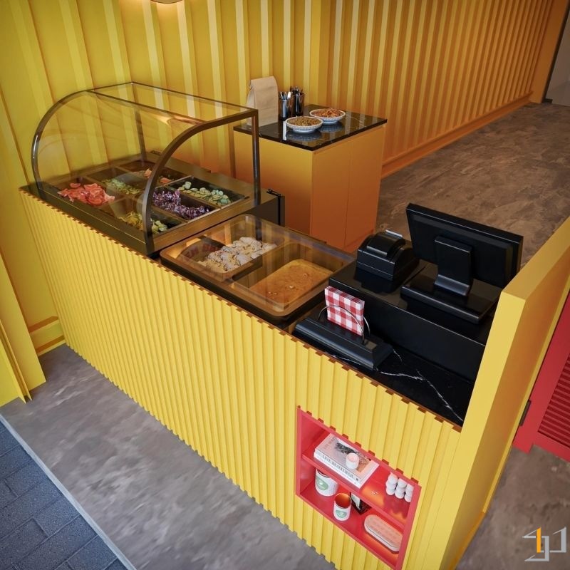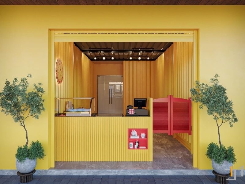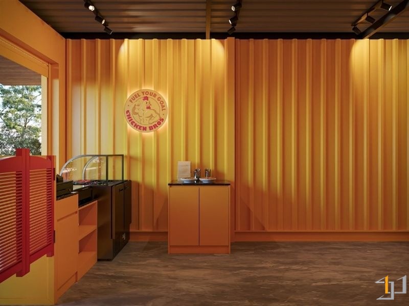 Chicken Bros mong muốn một không gian nhỏ gọn nhưng phải nổi bật, thu hút và truyền tải được tinh thần năng động của thương hiệu. Thiết kế tập trung giải quyết nhu cầu vận hành hiệu quả – bố cục được tối ưu giúp khách hàng dễ quan sát, nhân viên thao tác nhanh và không gian luôn gọn gàng, sạch sẽ. Điểm nhấn thương hiệu được thể hiện rõ qua gam vàng rực rỡ kết hợp sắc đỏ nổi bật, tạo cảm giác tươi vui, gợi liên tưởng đến sự nóng hổi và hấp dẫn của món ăn. Không gian tuy nhỏ nhưng mang lại năng lượng tích cực, giúp khách hàng cảm nhận trọn vẹn tinh thần “fast & fresh” mà Chicken Bros hướng tới – một tiệm cơm gà hiện đại, trẻ trung và đầy sức sống.
