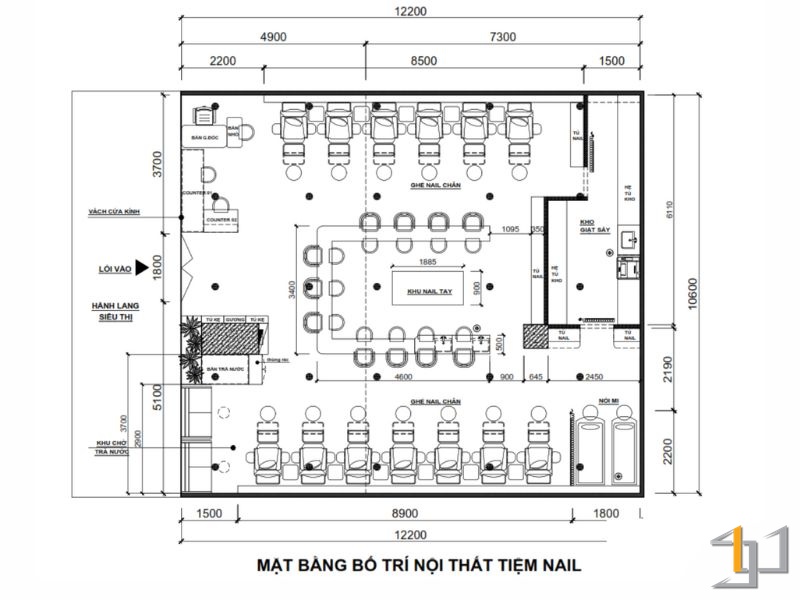 Phong cách tân cổ điển kết hợp với những gam màu trẻ trung như hồng, trắng, vàng,… và các chi tiết trang trí sang trọng. Khu vực lễ tân với phần logo được thiết kế nổi bật, tạo ra bầu không khí chào đón chuyên nghiệp. Khu làm móng được đặt những chiếc ghế da cao cấp, gây ấn tượng với những bức tường có hoa văn hình học độc đáo, mang đậm chất riêng. Đèn chùm mềm mại hình đám mây tại trung tâm tiệm nail thu hút mọi ánh nhìn. Khu ghế pedicure được sắp xếp gọn gàng, kết hợp giữa ghế bọc da và bồn ngâm chân riêng biệt, mang lại sự thoải mái tối đa cho khách hàng. Thiết kế tổng thể mang đến một không gian hài hòa, tinh tế và thoải mái.