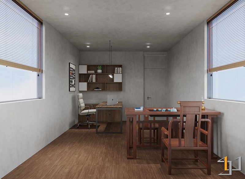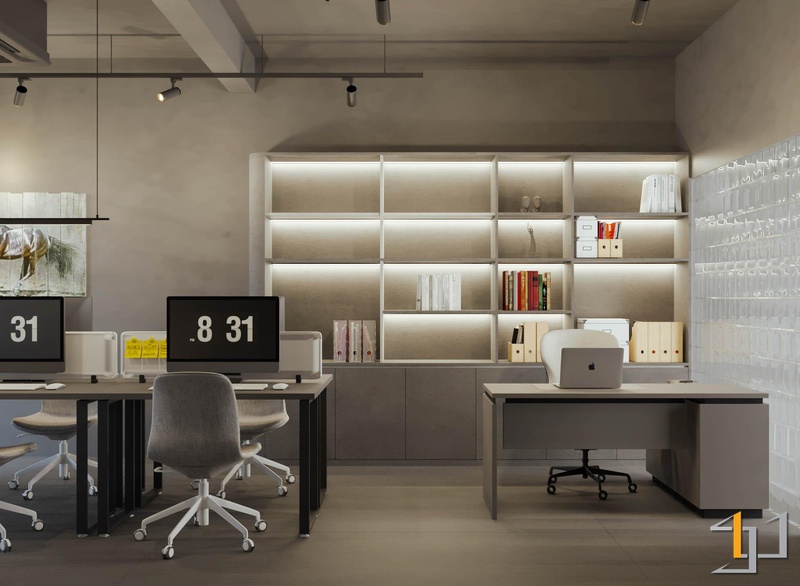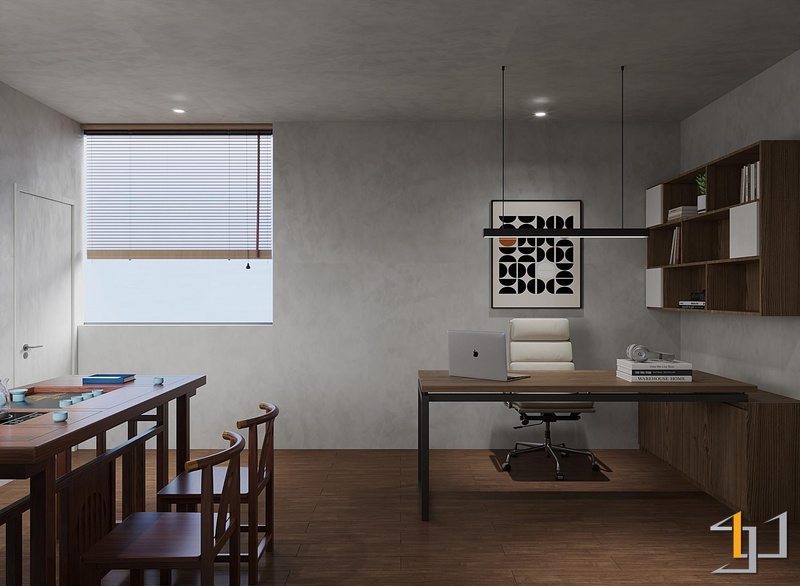 Không gian văn phòng được tổ chức theo hướng cân bằng giữa sự mạnh mẽ và cảm giác tĩnh tại, tạo nên môi trường làm việc tập trung nhưng vẫn dễ chịu. Các mảng tường và trần sử dụng sơn hiệu ứng bê tông xám thô mộc và liền mạch, trong khi hệ trần nan gỗ tại khu pantry mang lại sự ấm áp cần thiết.
