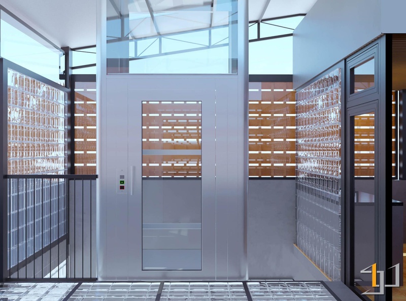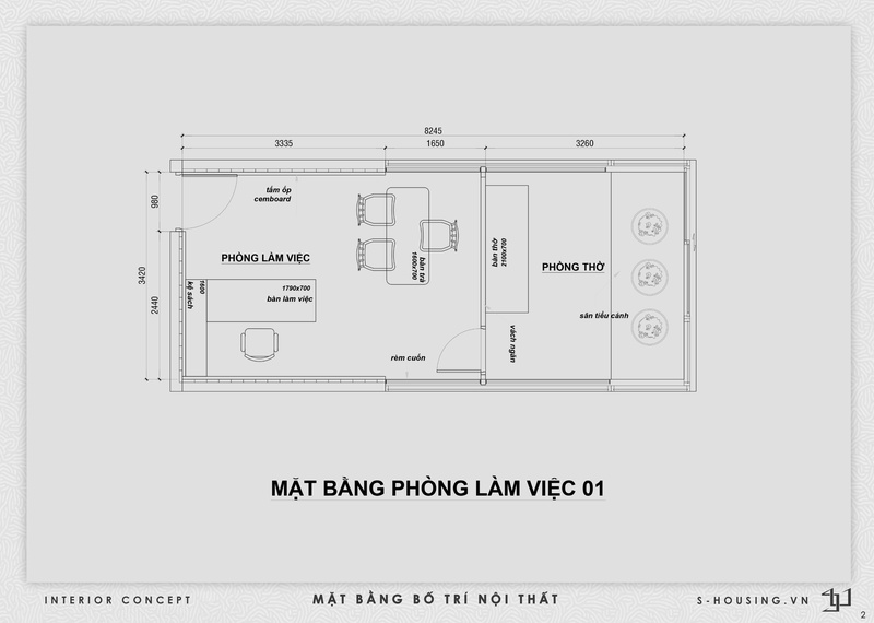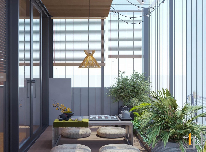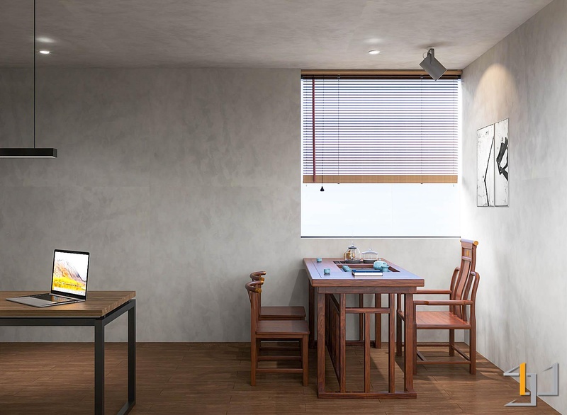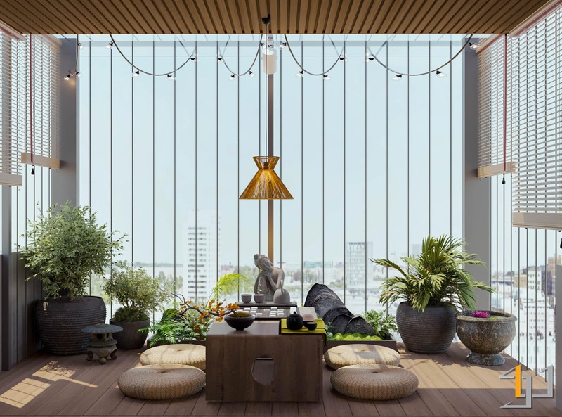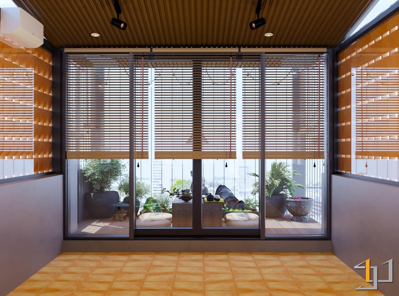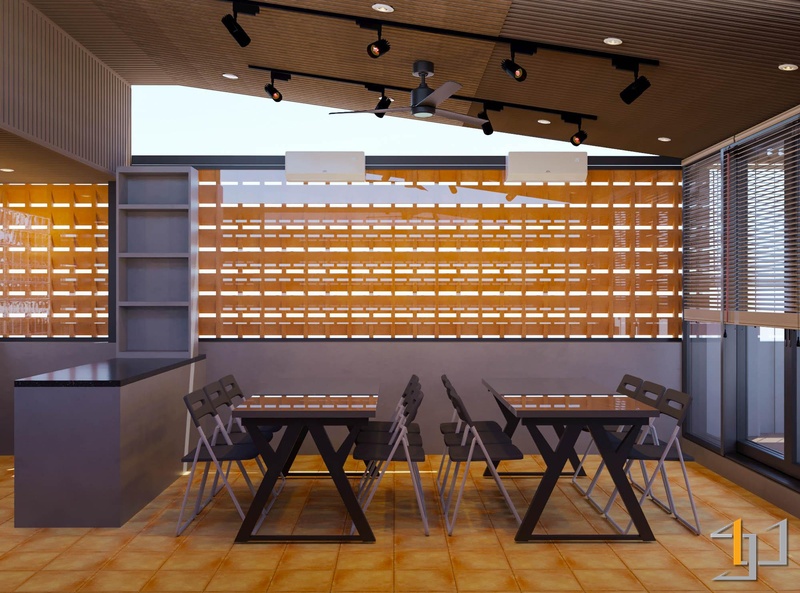 Nội thất kết hợp giữa gỗ tự nhiên, kim loại đen và kính, giúp không gian rõ ràng và gọn gàng. Các chi tiết như gạch kính, gạch thông gió, đèn tre đan và tiểu cảnh đá – gốm tạo chiều sâu và cảm giác thư giãn. Hệ đèn ray kết hợp ánh sáng tự nhiên qua rèm sáo gỗ giúp không gian luôn đủ sáng và thoáng cho quá trình làm việc.