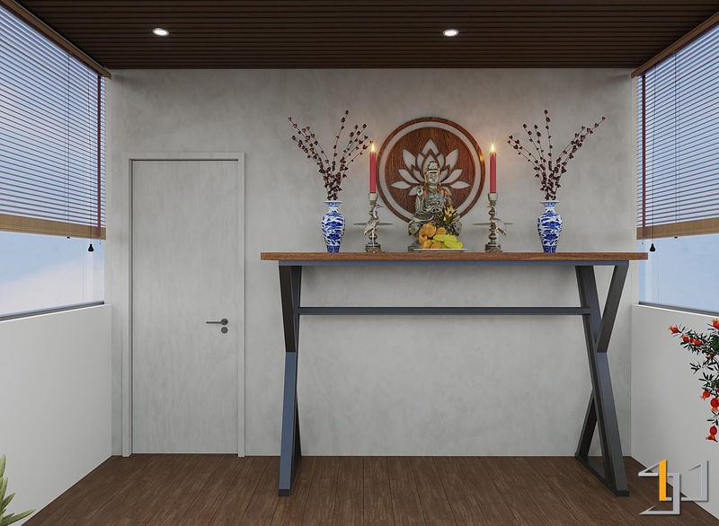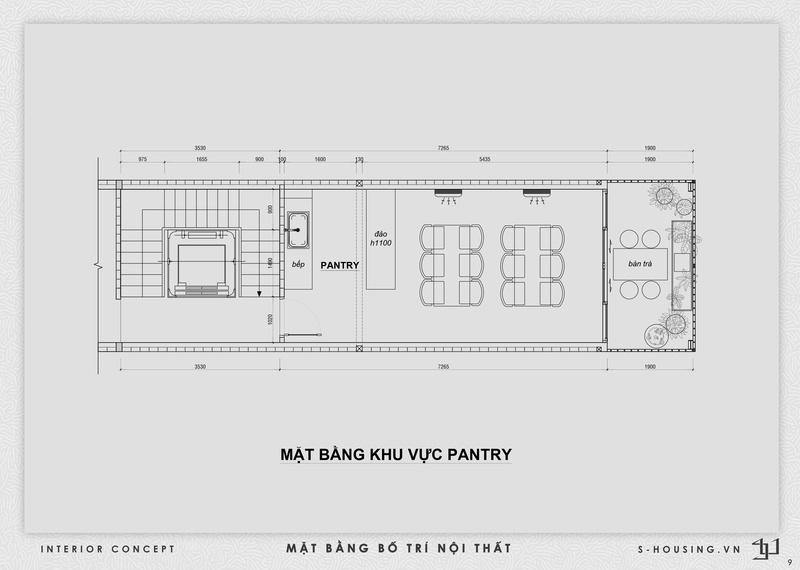 Mặt sàn khu làm việc giữ đồng nhất với tường, còn các phòng riêng sử dụng sàn gỗ nâu trầm để tăng cảm giác ổn định. Khu pantry và ban công dùng gạch nung màu đất, tạo điểm chuyển nhẹ và gần gũi hơn.