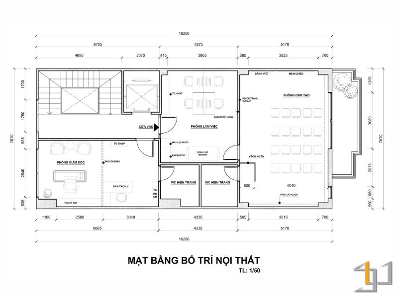 Văn Phòng Vạn Phúc được thiết kế nội thất ứng dụng phong cách hiện đại (modern), có màu sắc tươi sáng và đường nét dứt khoát, đáp ứng mong muốn của chủ đầu tư. Khu vực chức năng bên trong bao gồm: 1 phòng giám đốc, 1 phòng trợ lý, 1 khu vực làm việc chung của các nhân viên, 2 WC và 1 phòng đào tạo. Tại phòng nhân viên thường xuyên diễn ra hoạt động đi lại được trải thảm để hạn chế tiếng ồn ảnh hưởng đến quá trình làm việc. Phòng trợ lý đặt cạnh phòng giám đốc để thuận tiện cho việc tương tác hoặc đón tiếp đối tác công ty.