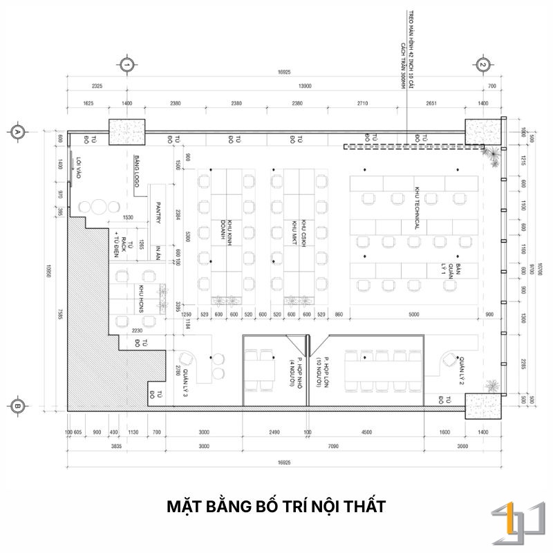 Mẫu thiết kế nội thất văn phòng VNETWORK phong cách hiện đại (Modern), tạo dựng hình ảnh chuyên nghiệp được nhiều công ty ưa chuộng. Thiết kế mở ra một không gian làm việc tiện nghi, tạo điều kiện cho nhân viên sáng tạo và làm việc hiệu quả hơn. Bên cạnh khu vực làm việc được bố trí khoa học, thuận tiện thì các tiện ích sinh hoạt khác như tủ bàn trà, bàn ghế căn tin, phòng họp,.. đều được đảm bảo đầy đủ cho nhân viên.